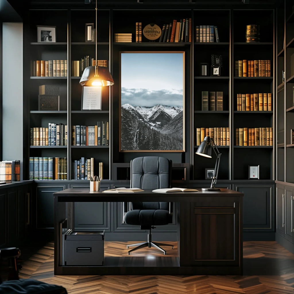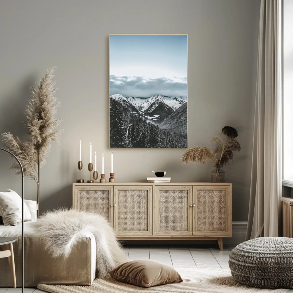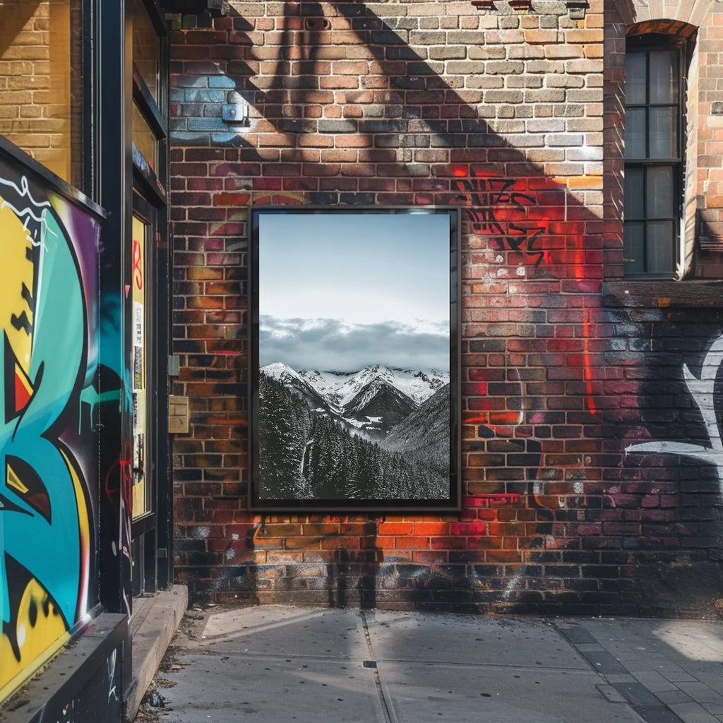 Experience the awe-inspiring beauty of the Majestic Snow-Covered Mountains National Park Poster, a photorealistic national park poster that captures a snow-covered alpine landscape in all its serene grandeur. The sweeping view reveals dramatic mountains and deep valleys cloaked in fresh snow, complemented by dark, snow-dusted pine forests. A narrow winding road threads through the scene, adding a sense of adventure amid the tranquil wilderness. The cool color palette—whites, blues, and dark greens—lends a peaceful yet powerful presence to any space.