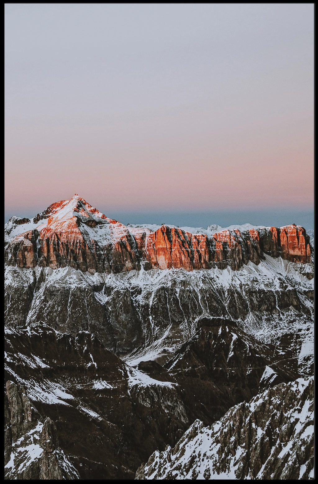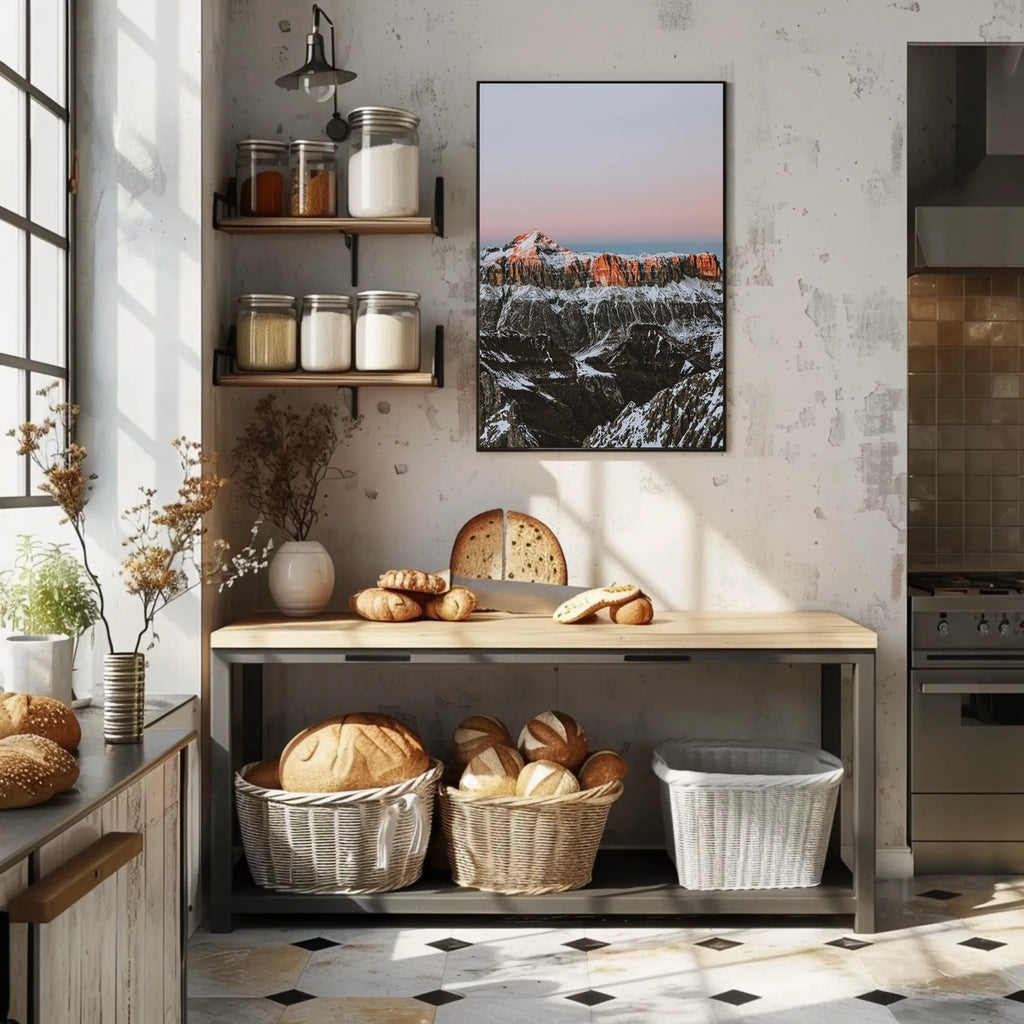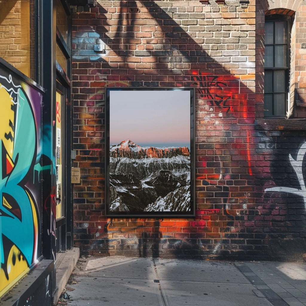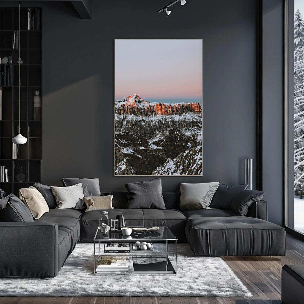 - Detailed design highlighting the dramatic sunrise glow on snow-capped peaks