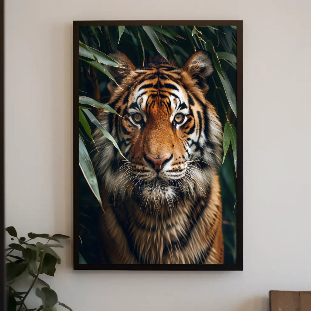 Bring the wild into your living space with the Majestic Tiger in the Wild Art Print Poster from PosterGoat — a breathtaking wildlife poster that captures a tiger's intense gaze framed by lush foliage. This high-quality print transforms any room with vivid colors, lifelike detail, and a minimalist composition that complements modern interior design.