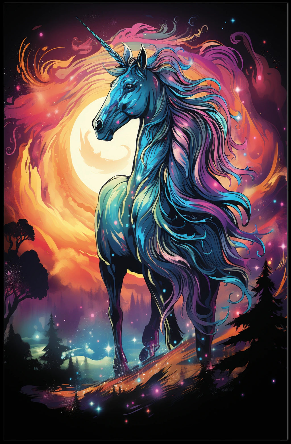 - Detailed design highlighting the unicorn's flowing mane in blue, purple, and pink that seamlessly transitions into a surreal cosmic backdrop