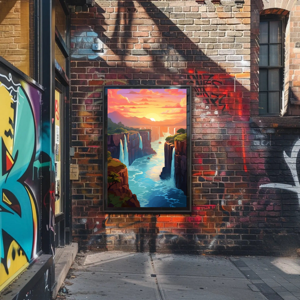 This poster captures the essence of Majestic Waterfalls At Sunset. Designed for decor lovers and wanderlust spirits, this art print adds charm to any room with visuals inspired by real-world scenery.