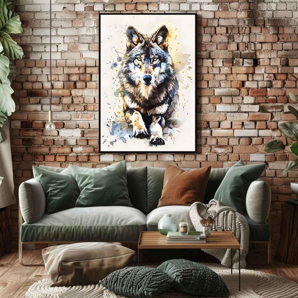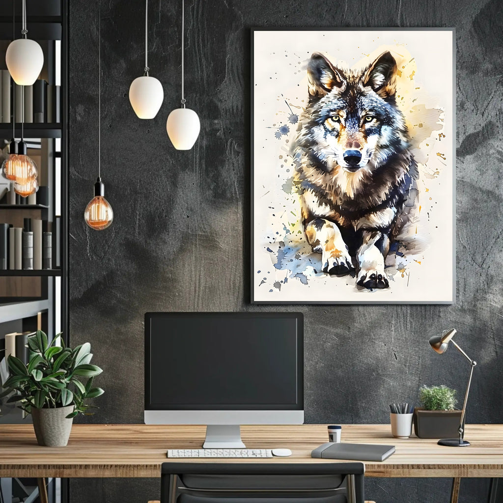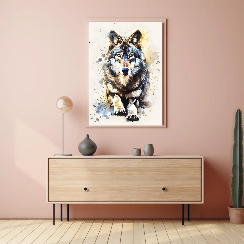 This poster captures a lifelike wolf with piercing, focused eyes and rich fur detail, surrounded by dynamic artistic splatters and soft watercolor washes. The result is a bold, contemporary wildlife artwork that blends realism with modern abstract expression to create movement and emotion on every wall.