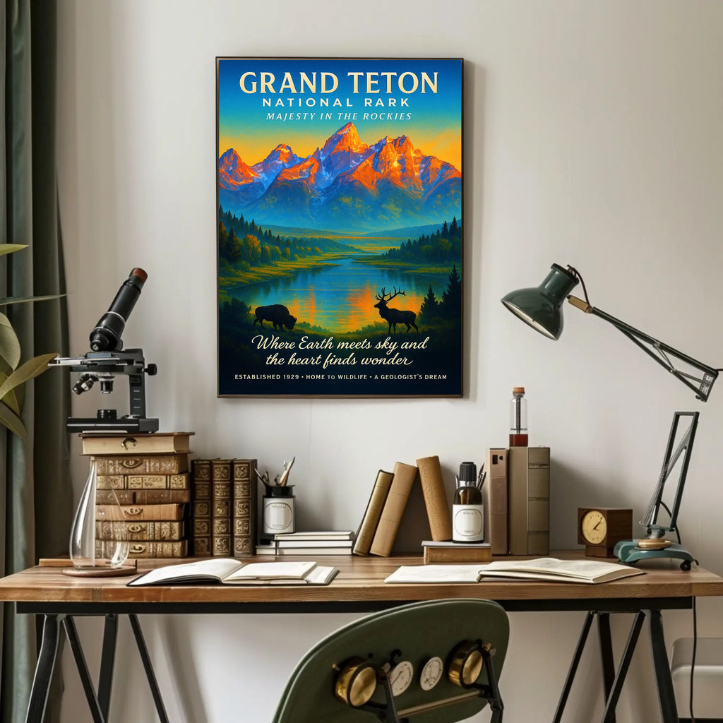 Majesty in the Rockies — Grand Teton National Park Poster from PosterGoat brings the drama of alpine peaks, reflective waters, and roaming wildlife into your home. This travel-inspired poster blends minimalist design with vivid, painterly color to create a focal piece that complements living rooms, offices, and gallery walls.