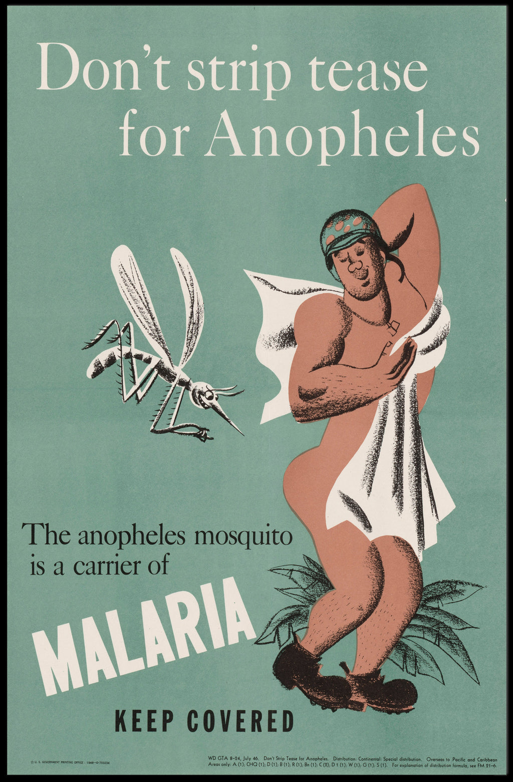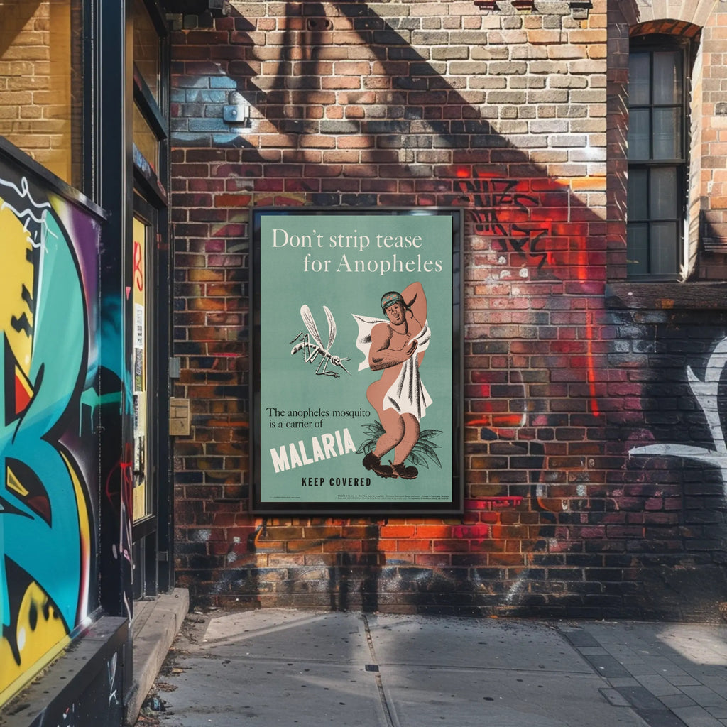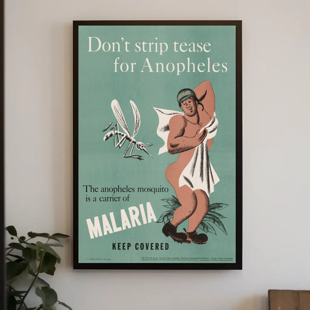 This unique vintage poster delivers a public health warning about malaria prevention with a playful twist. It humorously advises against exposing skin to Anopheles mosquitoes, cleverly using the phrase "Don’t strip tease for Anopheles." The poster is adorned with bold, mid-20th century illustrations of a stylized mosquito and a person wrapped in a towel, creatively capturing attention while emphasizing a serious message. The artistic style blends humor with caution, making it a collectible piece for public health enthusiasts and vintage art lovers. Ideal for educational spaces, this poster holds both visual and historical significance.