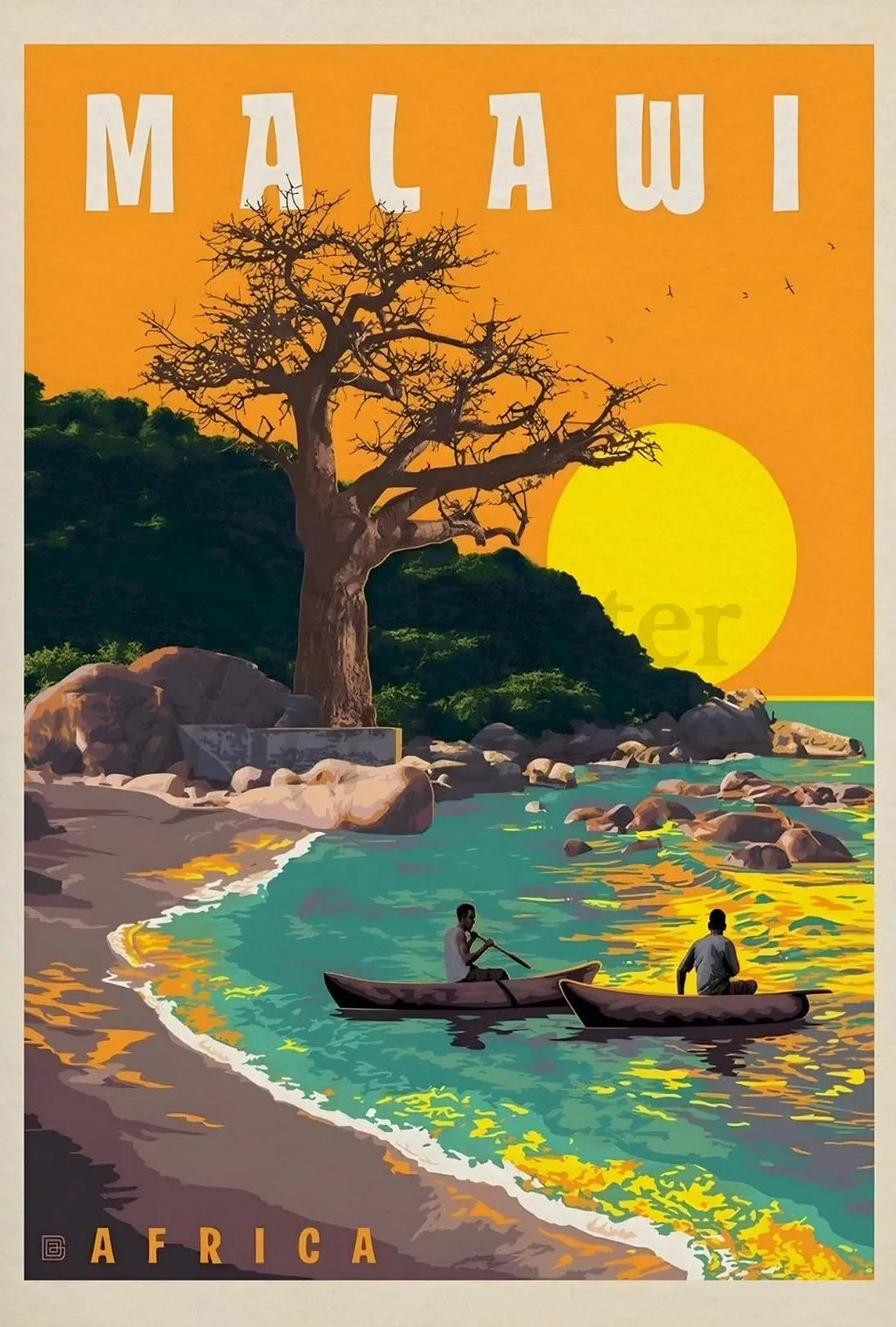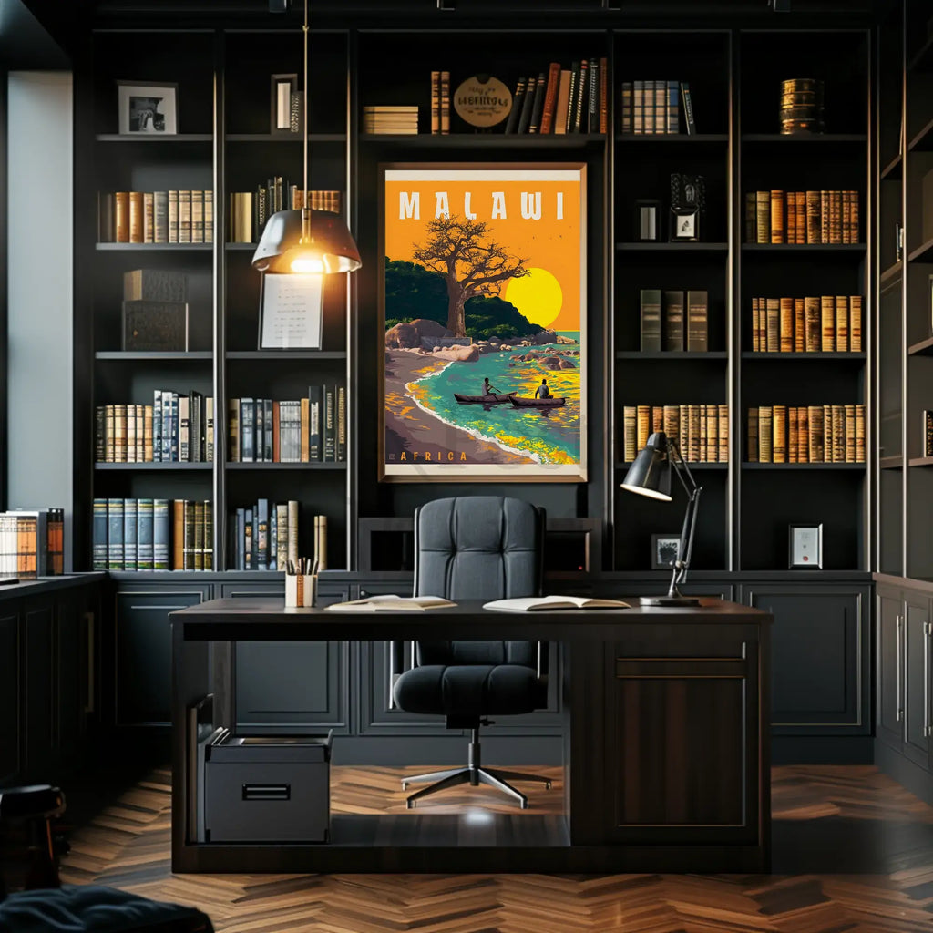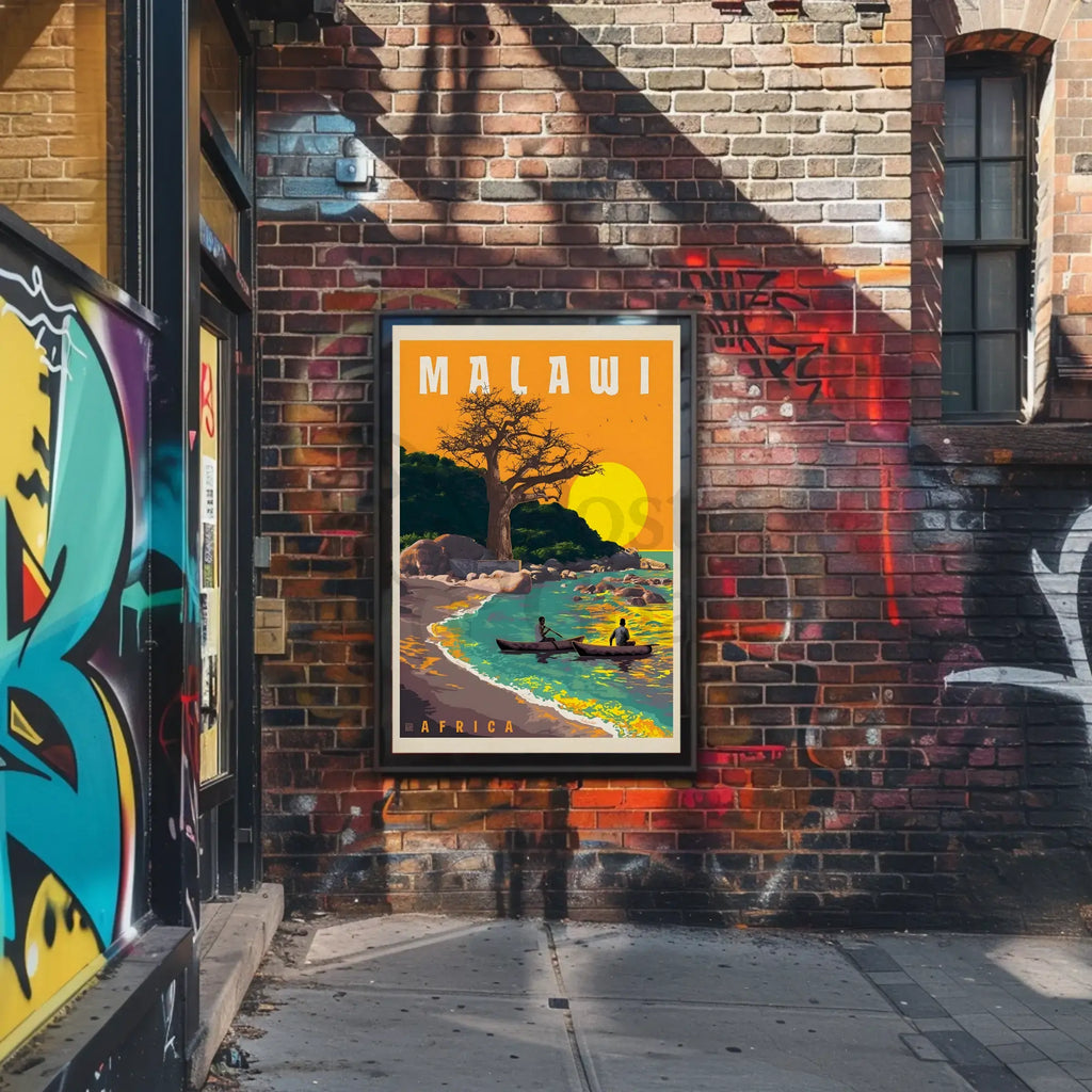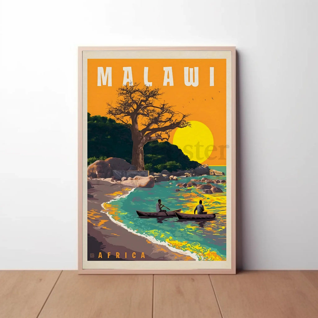 Discover the breathtaking allure of Malawi with this vintage-style travel poster. Capturing the essence of a serene lakeside scene, it features a majestic baobab tree and traditional canoes gliding across the turquoise waters of Lake Malawi. Warm oranges and yellows of the sun and sky contrast beautifully with the cool tones of the water, creating a harmonious and idyllic atmosphere. Perfect for enthusiasts of mid-20th-century travel art, this poster evokes a sense of adventure and tranquility, making it an ideal addition to any home or office space seeking a touch of exotic charm.