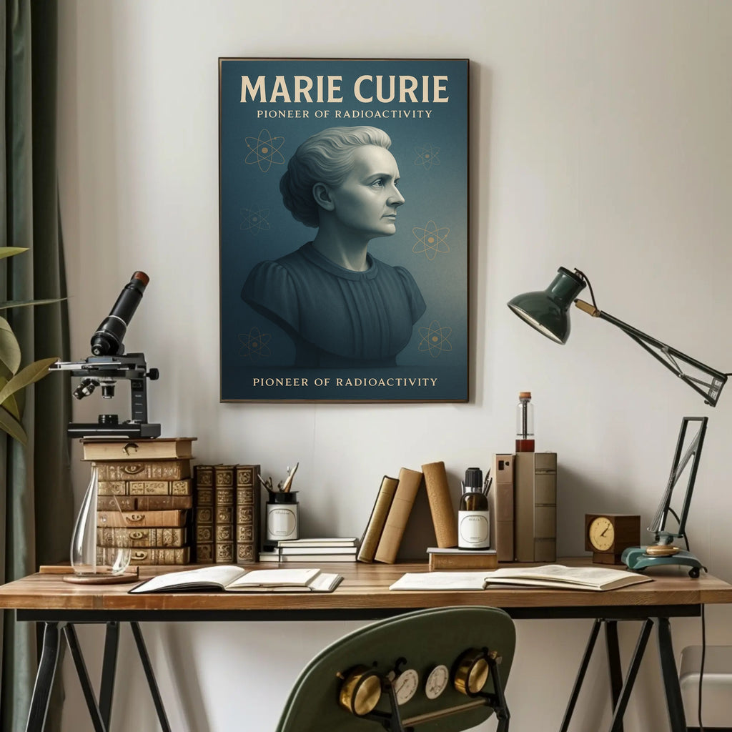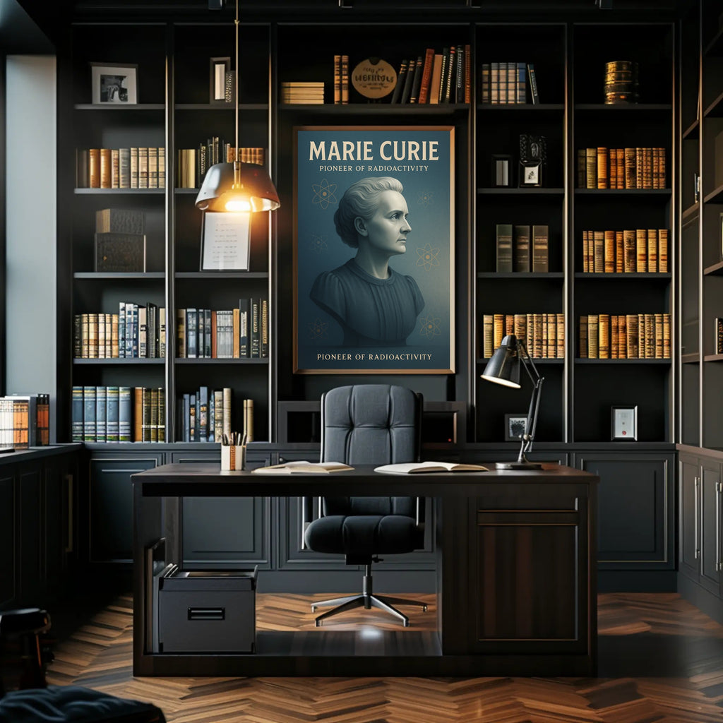 This Marie Curie poster makes a thoughtful inspirational gift for students, teachers, scientists, and history lovers — or a powerful decorative statement for offices, libraries, and classrooms. Add this piece of scientific art to your collection and showcase the legacy of a true pioneer in radioactivity.