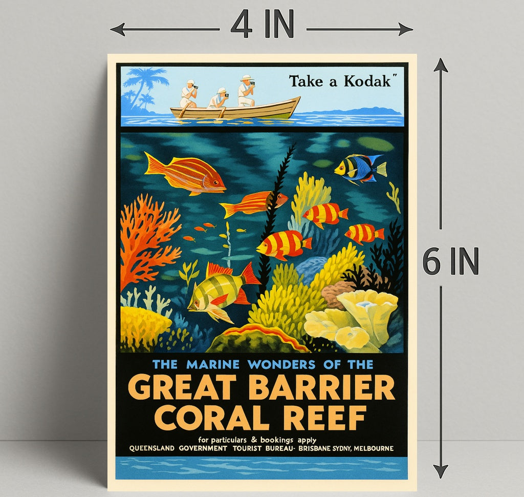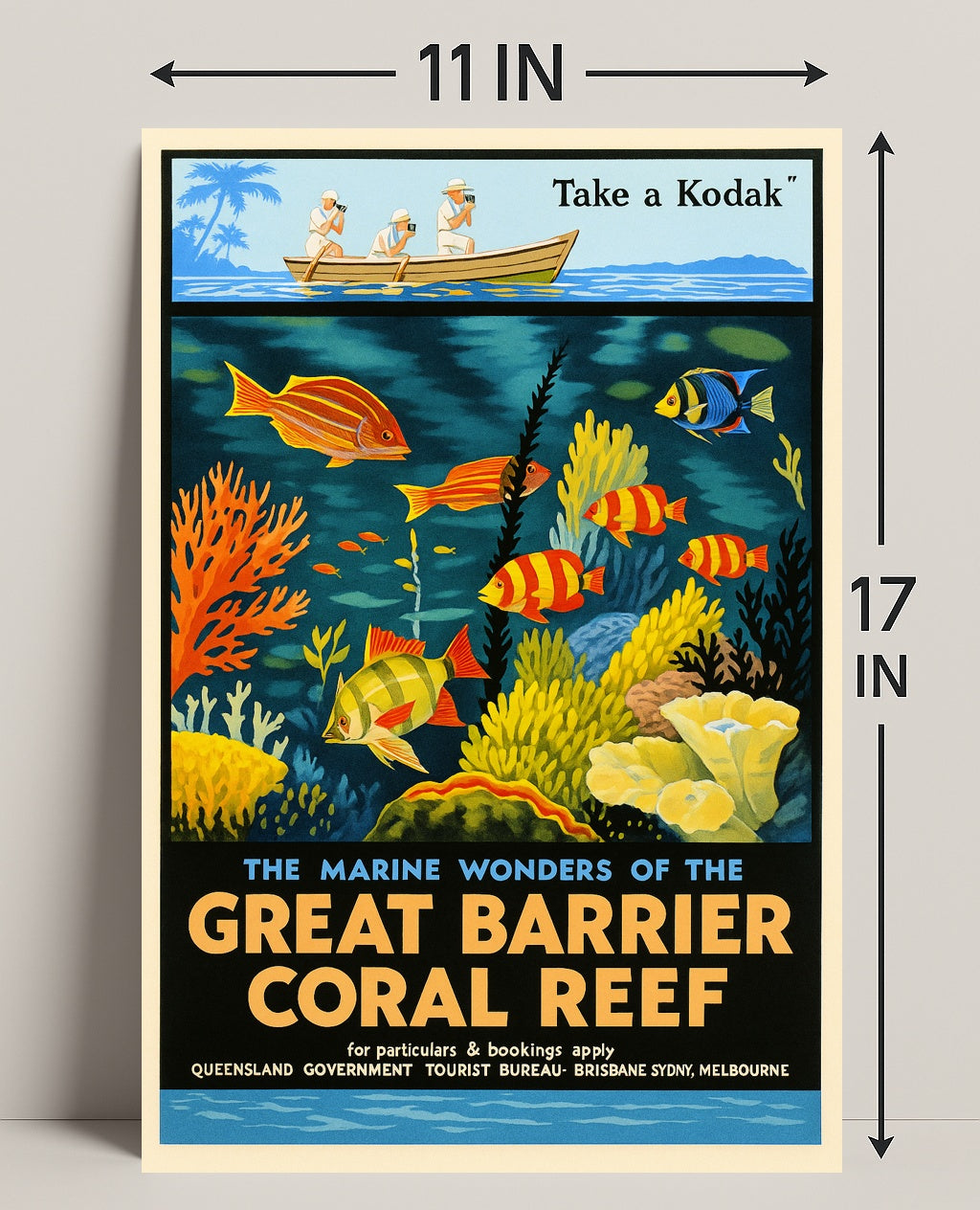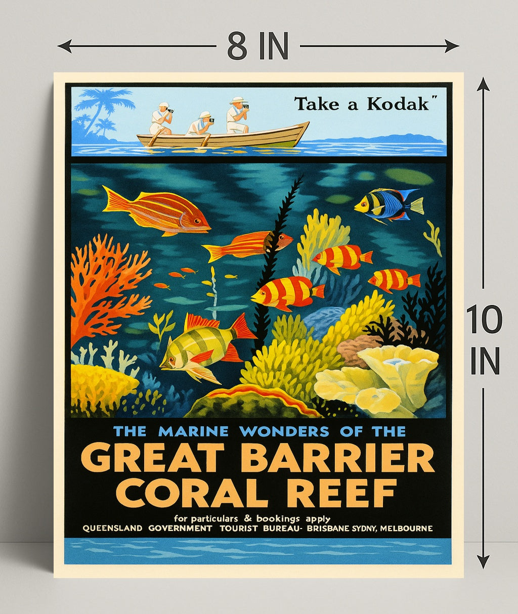 Whether you're curating a themed wall or searching for a distinctive gift, this poster blends vintage charm with modern simplicity. Add the Marine Wonders of the Great Barrier Reef Poster to your space today and bring the ocean's colors home.