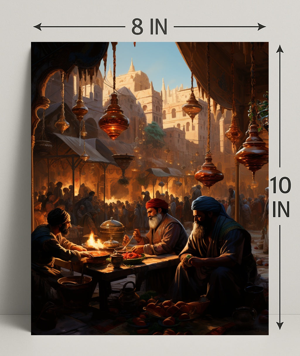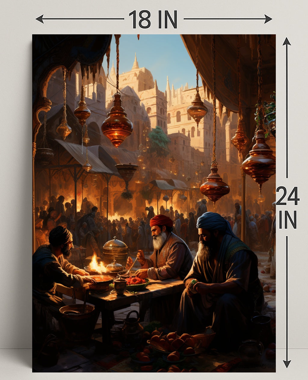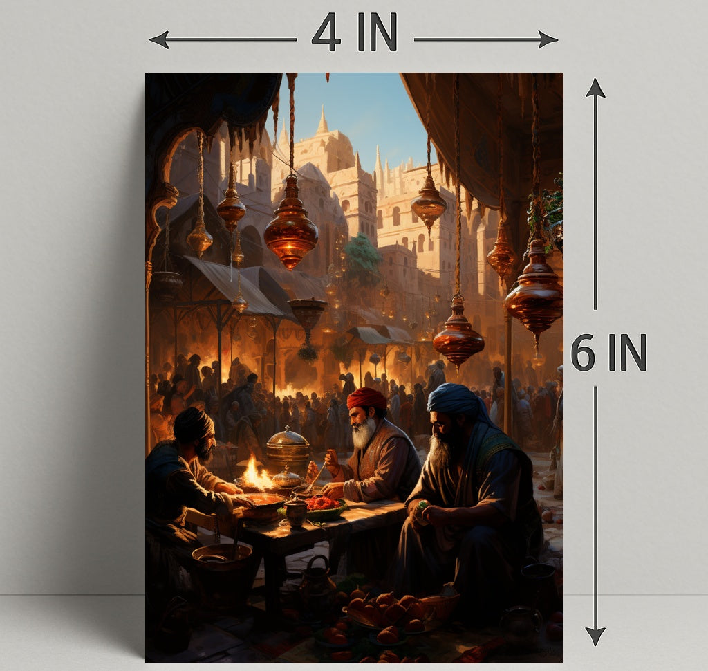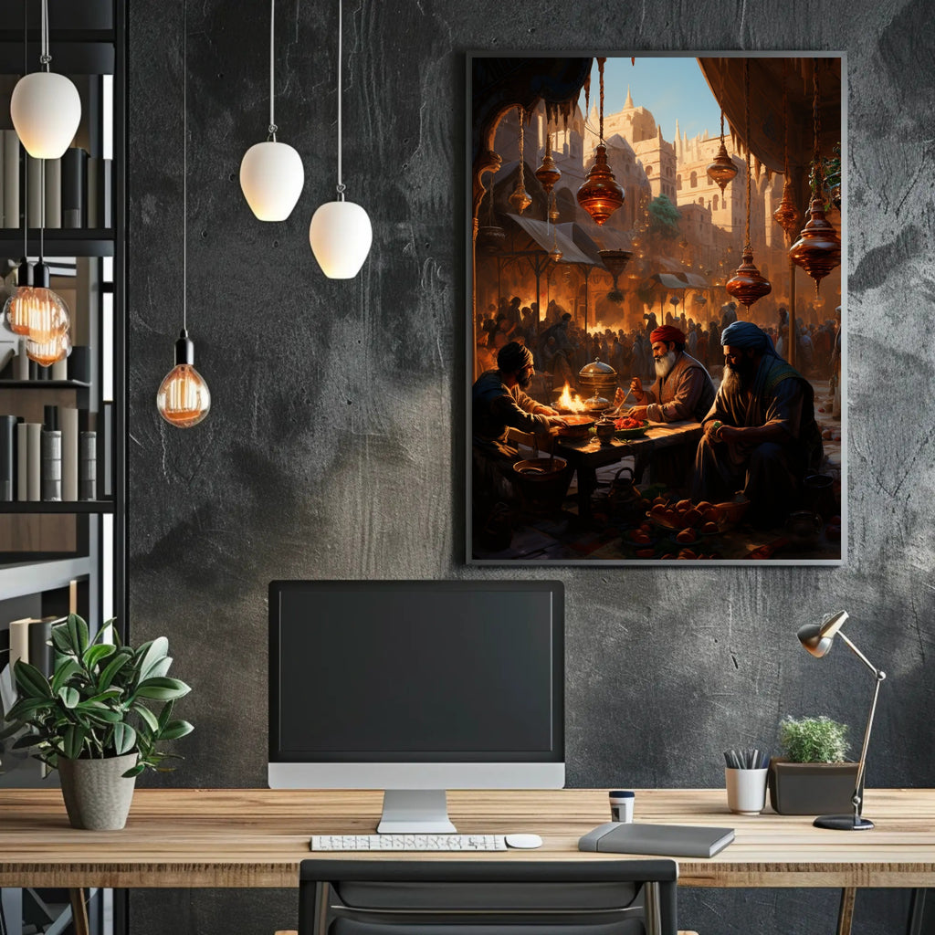 Bring a moment from history into your home with the Market Scene In An Ancient City Poster by PosterGoat. This richly detailed print captures a bustling marketplace at golden hour — ornate hanging lanterns, sunlit sandstone architecture, and a lively crowd forming a dramatic backdrop as three merchants share food and stories at a low wooden table. Every glance reveals new narrative details, from steaming dishes and fruit baskets to the carved arches and spires that frame the city beyond.