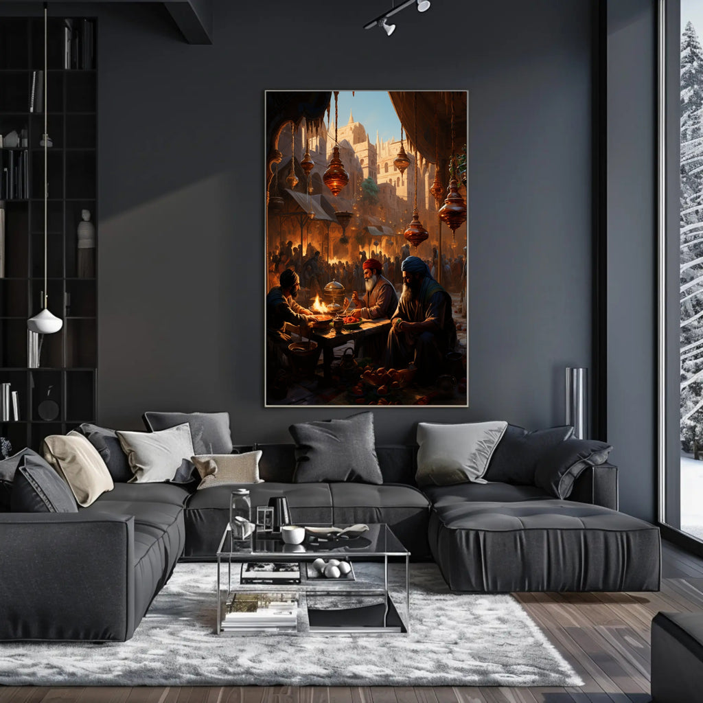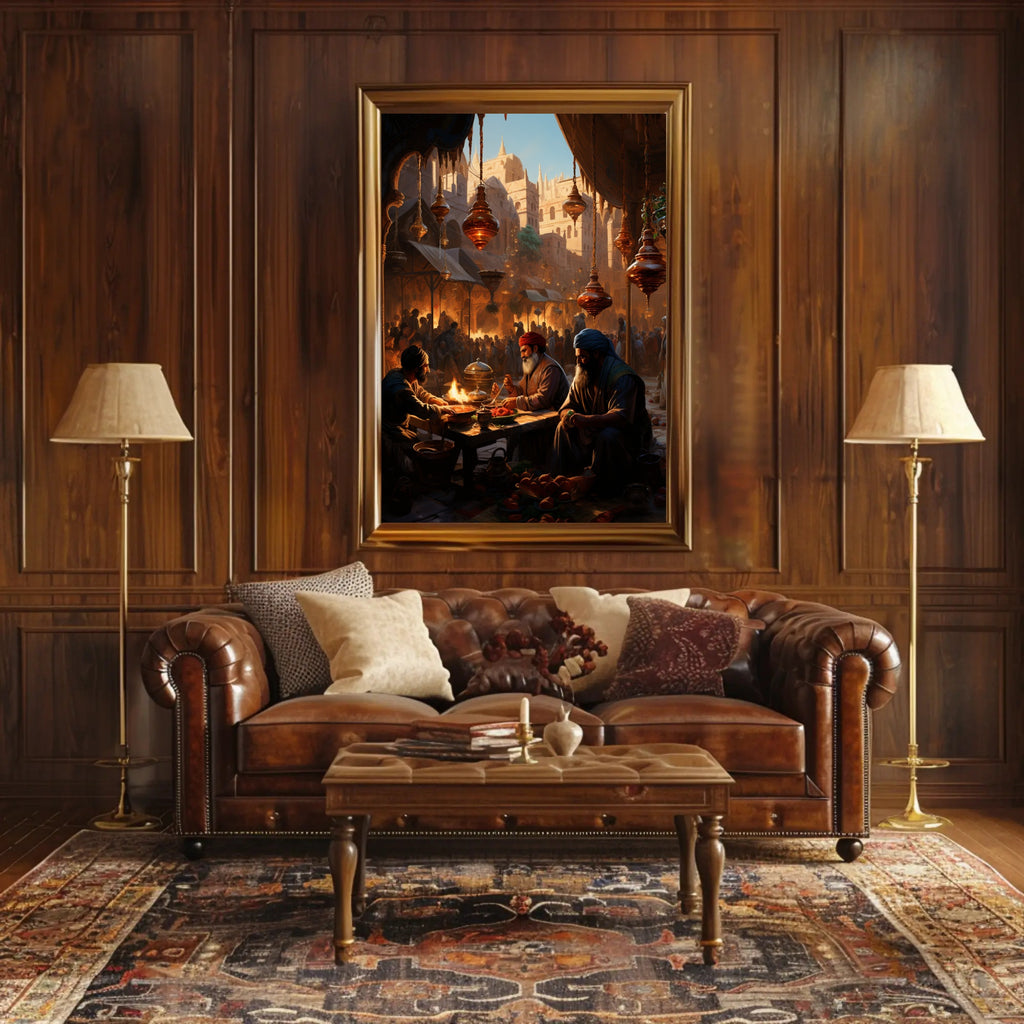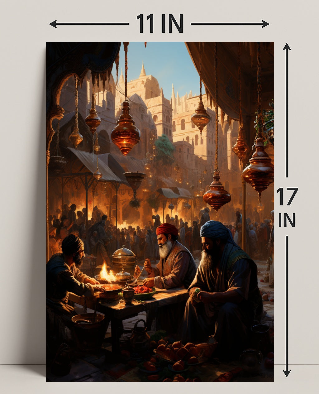 Bring a moment from history into your home with the Market Scene In An Ancient City Poster by PosterGoat. This richly detailed print captures a bustling marketplace at golden hour — ornate hanging lanterns, sunlit sandstone architecture, and a lively crowd forming a dramatic backdrop as three merchants share food and stories at a low wooden table. Every glance reveals new narrative details, from steaming dishes and fruit baskets to the carved arches and spires that frame the city beyond.