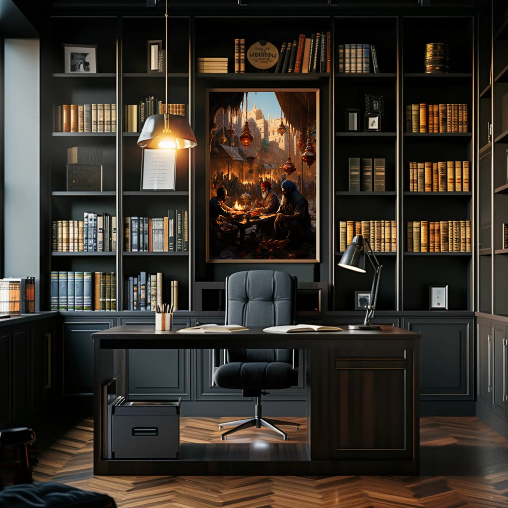 Atmospheric artwork: Warm, cinematic lighting and deep, textured shadows create a mood of timeless travel and discovery — perfect for living rooms, studies, or entryways.