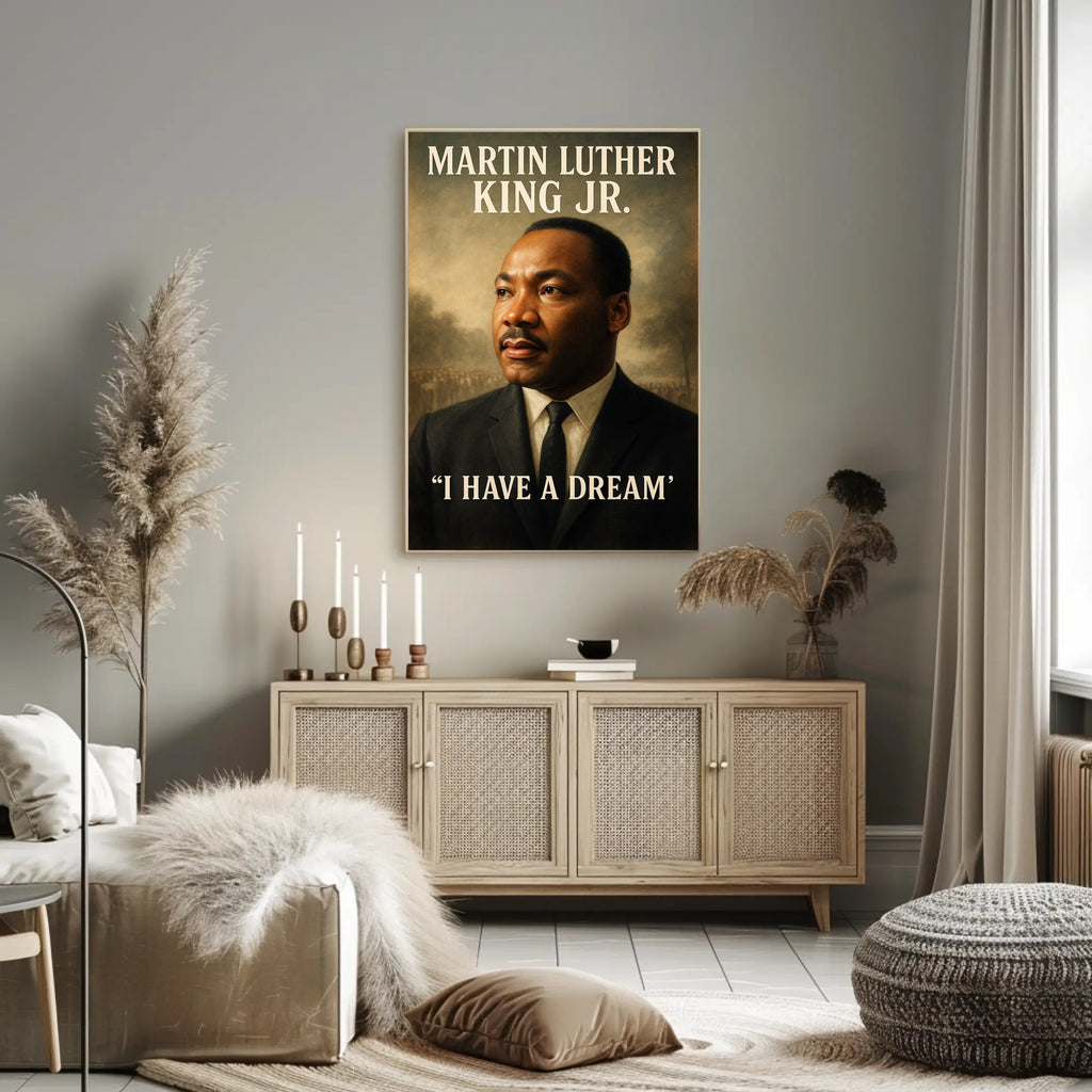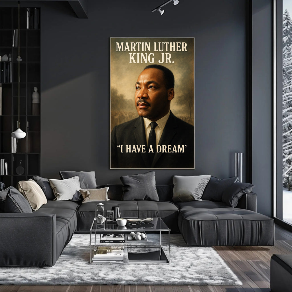 Timeless portraiture: This high-contrast, painterly print features a dignified three-quarter portrait framed by soft, atmospheric tones and bold, classic typography that reads “MARTIN LUTHER KING JR.” at the top and “I HAVE A DREAM” at the base — a powerful focal point that commands attention and inspires reflection.