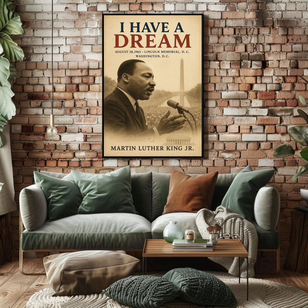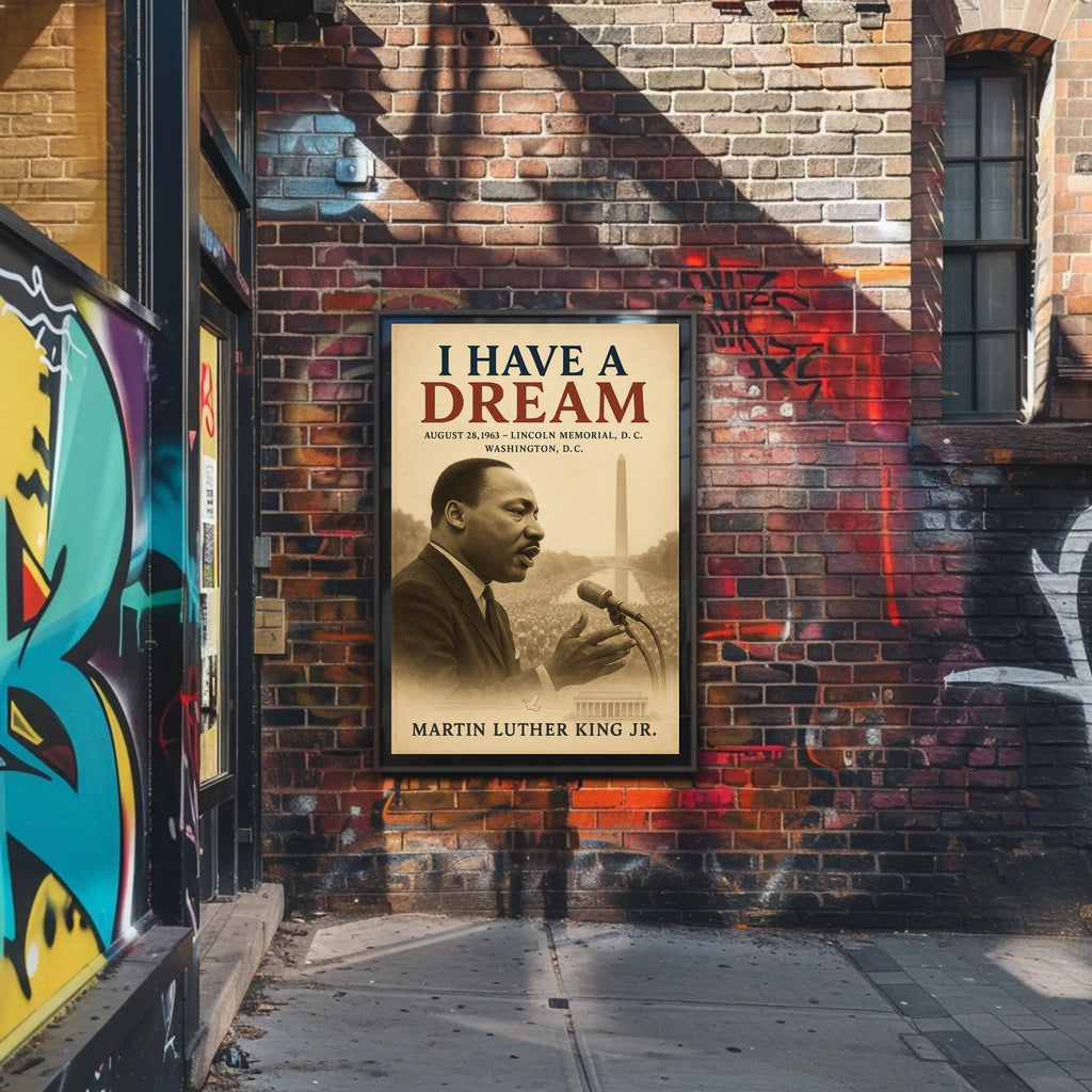 The sepia-toned portrait and bold typographic headline capture the energy of the August 28, 1963 speech at the Lincoln Memorial, while subtle background details — the Washington Monument, the reflecting pool and a sea of listeners — give the piece authentic depth. Printed with museum-quality inks on heavyweight paper, this poster brings historic significance and timeless style to your walls.