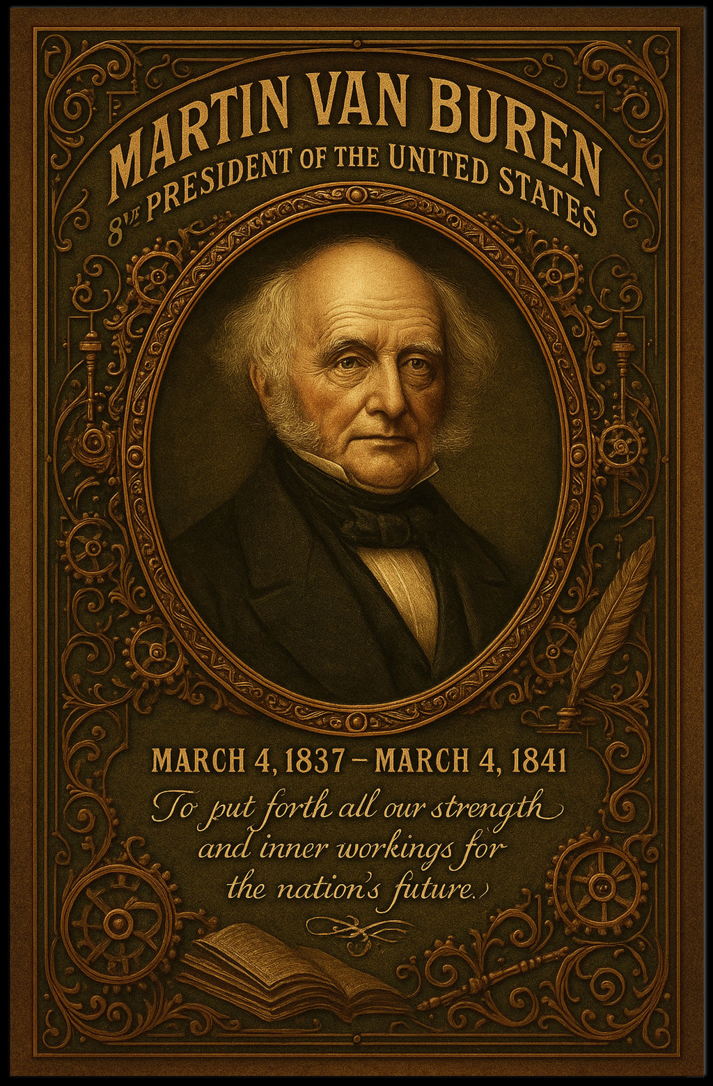 - Poster theme & style: Art & Aesthetic; Minimalist influences with a vintage, presidential subtheme — 8th President, Martin Van Buren, Presidential Souvenir.