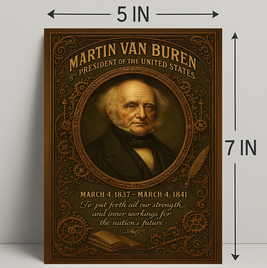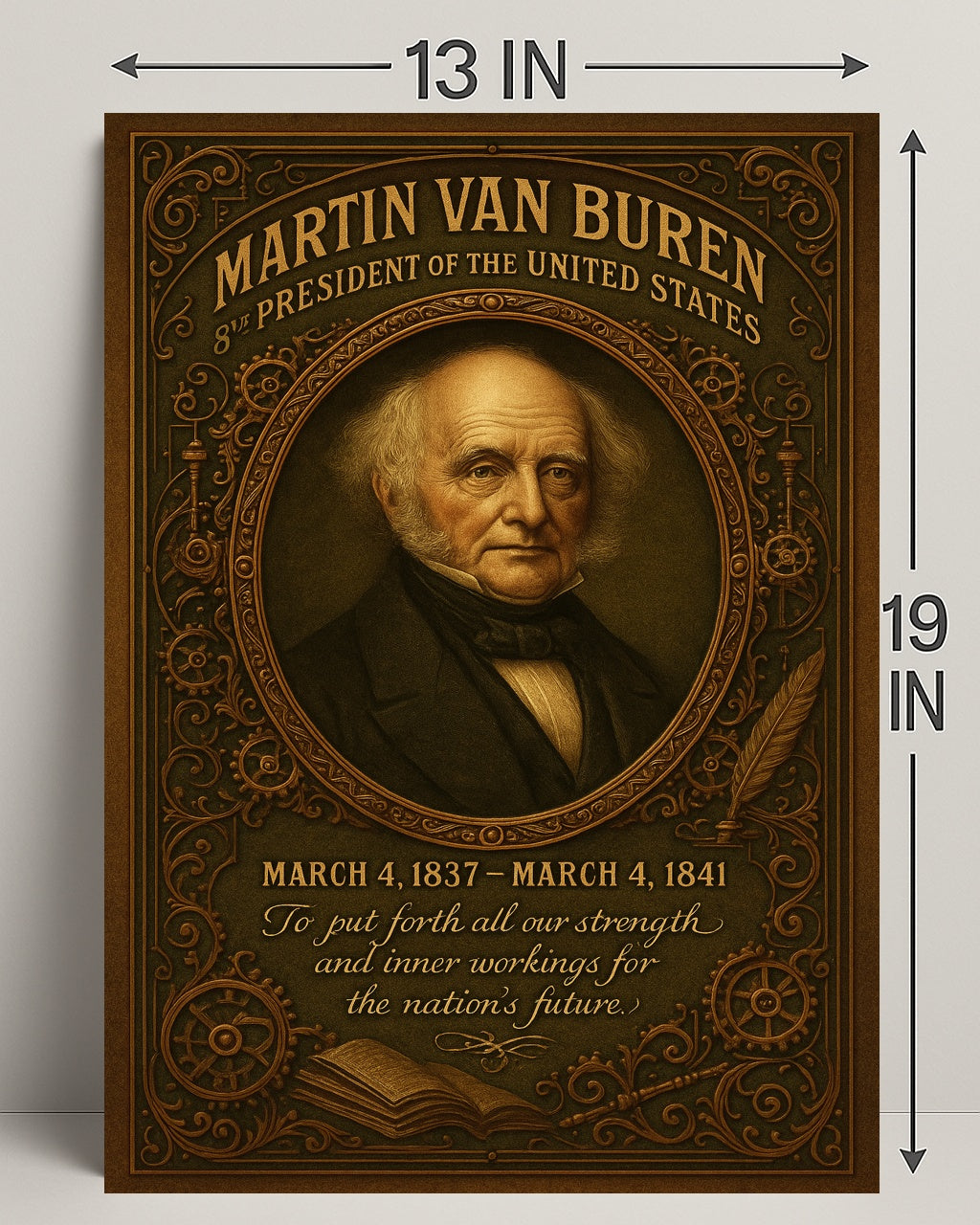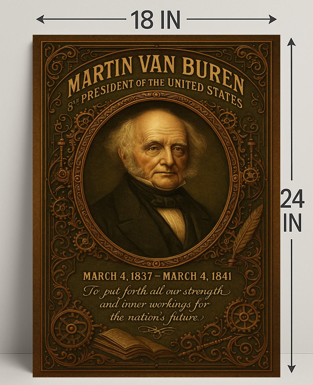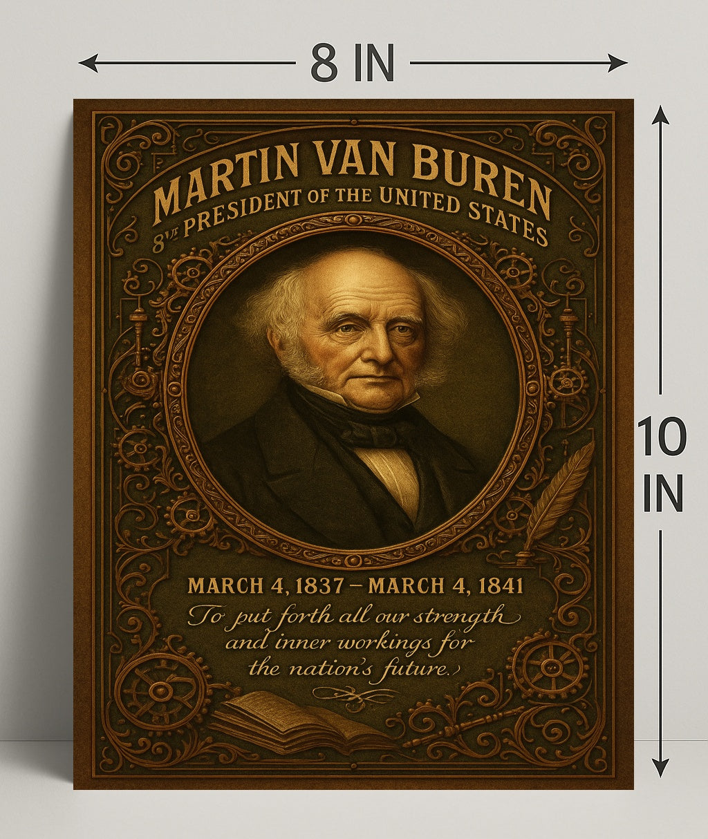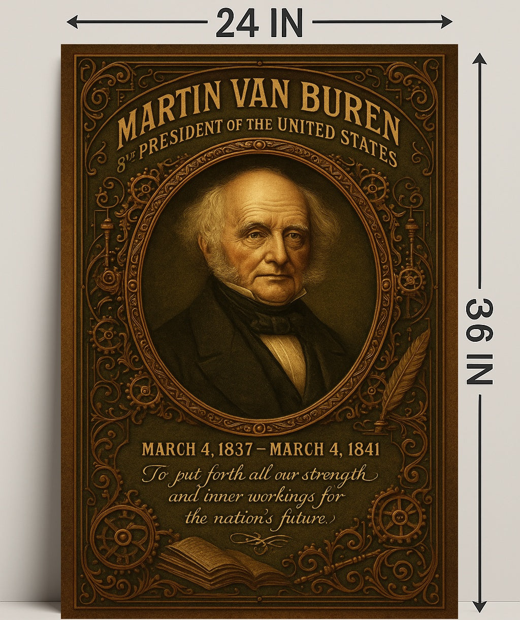 This premium print features a finely rendered oval portrait of Martin Van Buren framed by intricate filigree, vintage gears and scrollwork, a classic quill and open book motif, plus the dates of his presidency (March 4, 1837 – March 4, 1841) and an inspiring excerpt rendered in elegant script. The warm gilt and sepia tones, raised-letter styling and ornate border create an authentic collectible look that reads as both historical artifact and refined wall art.