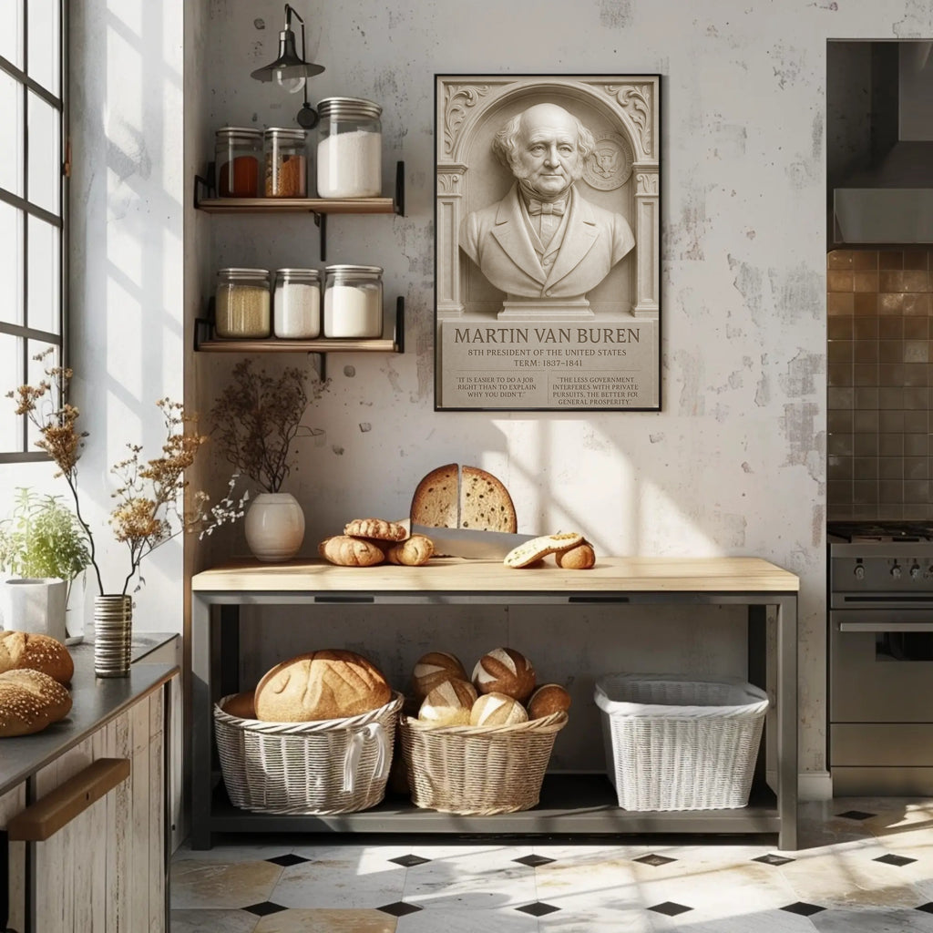 Add the Martin Van Buren Bust Vintage Historical Presidential Poster to your collection from PosterGoat today — order now to elevate your space with a distinguished piece of presidential art.