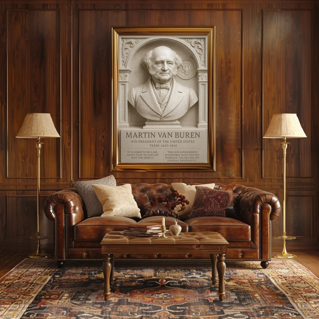 Bring a piece of 19th century American history into your home or office with the Martin Van Buren Bust Vintage Historical Presidential Poster from PosterGoat. This striking poster reproduces a finely detailed marble-style bust set within an ornate carved niche — a timeless focal point that blends vintage style with minimalist décor.