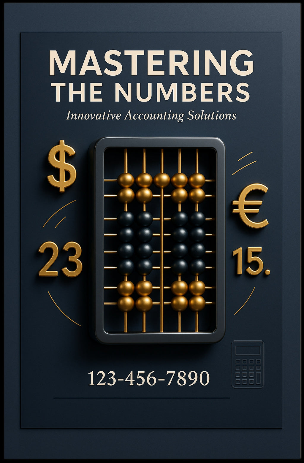 This elegant accounting poster pairs classic numerical symbolism (abacus, currency icons and bold numerals) with modern design, making it a perfect addition to accountant offices, finance departments, home workspaces, and classrooms. The clean typography “MASTERING THE NUMBERS” and subtle calculator imprint reinforce the theme of precision and innovation while maintaining a refined aesthetic.