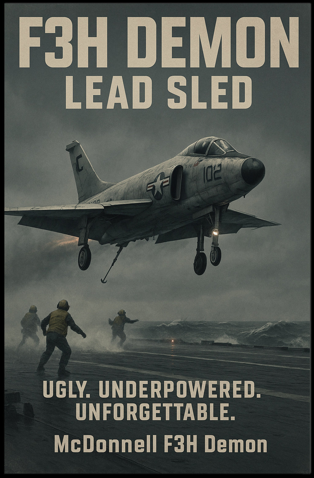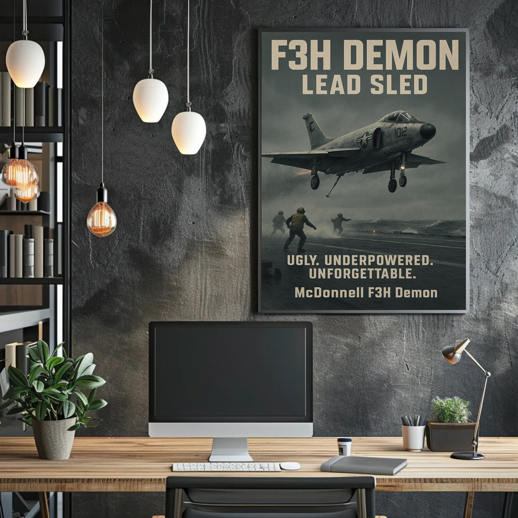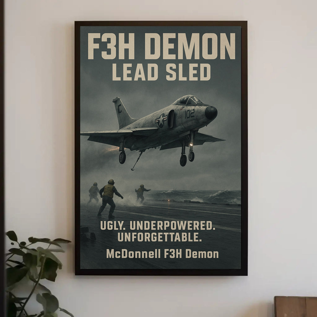 Ugly. Underpowered. Unforgettable. This poster celebrates the character and legacy of the McDonnell F3H Demon—an unapologetically authentic statement piece that complements vintage aviation collections, man caves, study walls, or gallery-style displays.