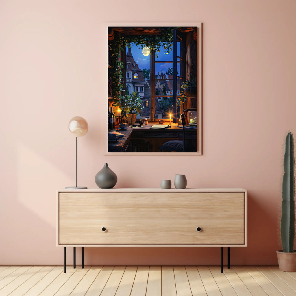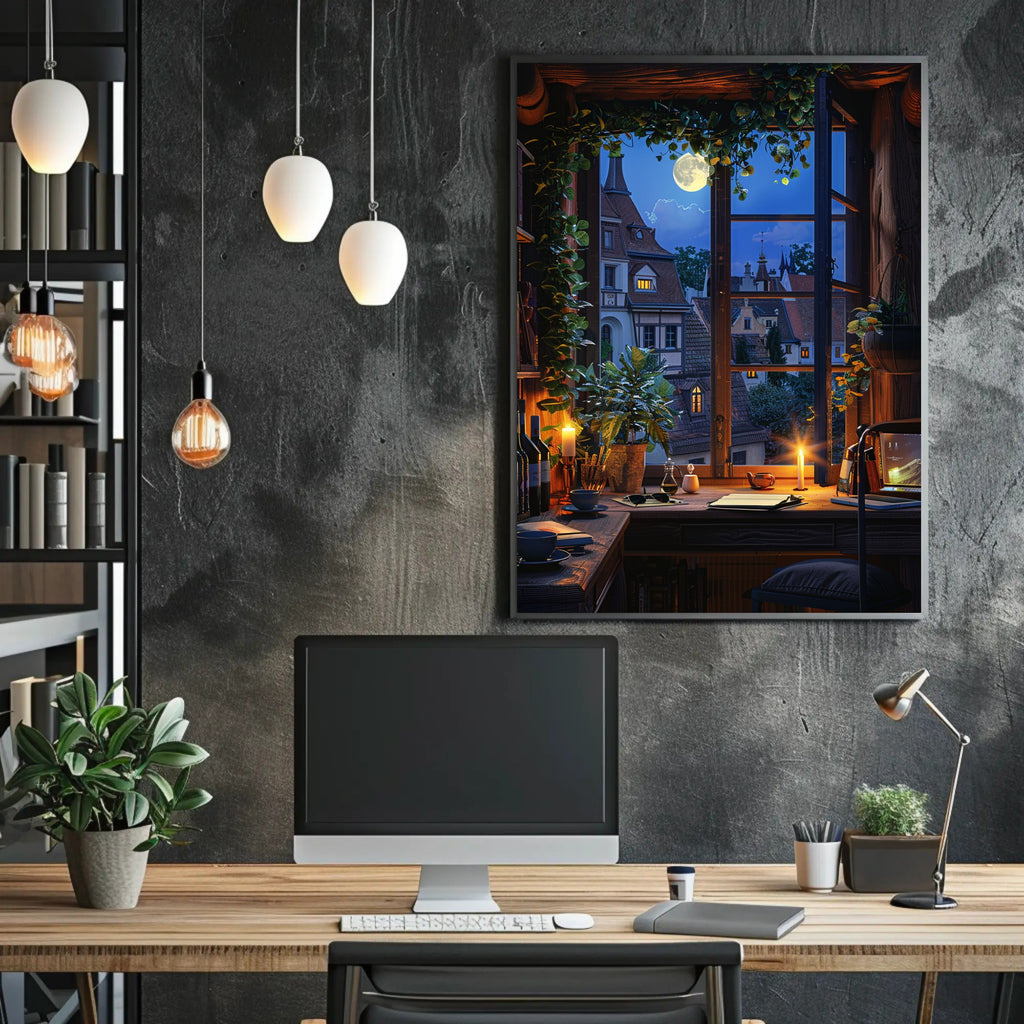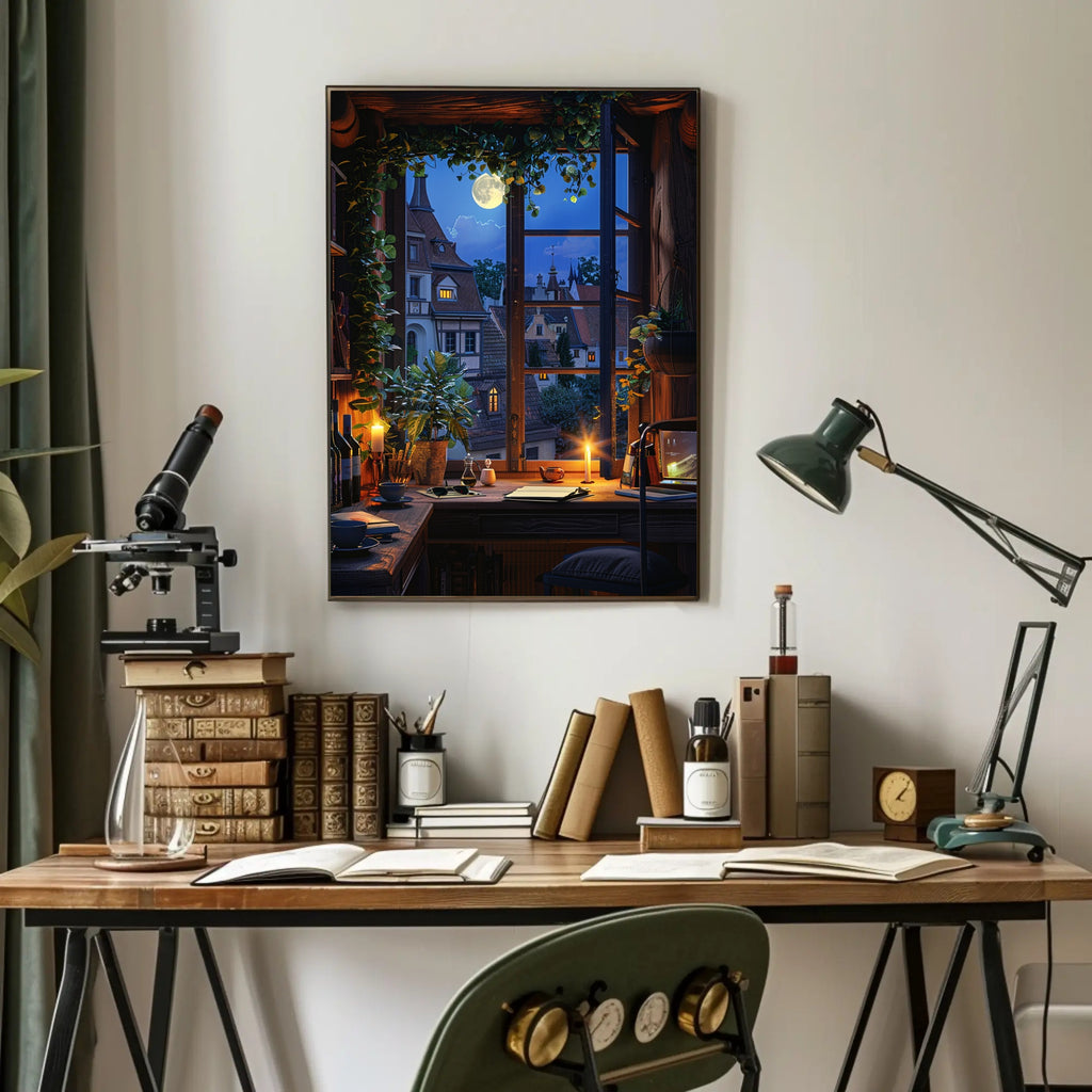 This piece blends mythical elements with an intimate indoor vignette—candles, potted plants, and a well-worn desk visible in the foreground—inviting viewers to imagine the story behind the hooded authority. The emerald-studded medallion provides a metallic focal accent that contrasts beautifully with the deep blues of a twilight sky.
