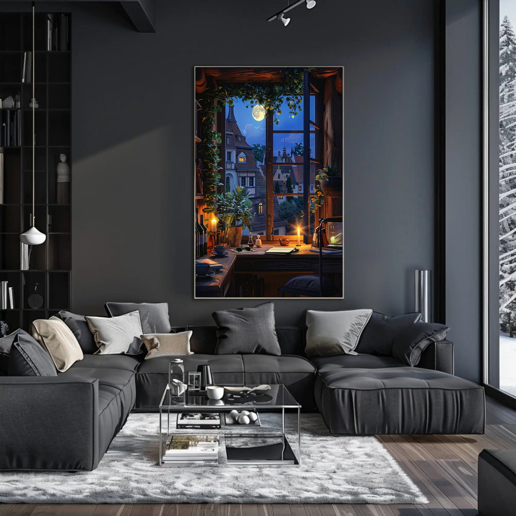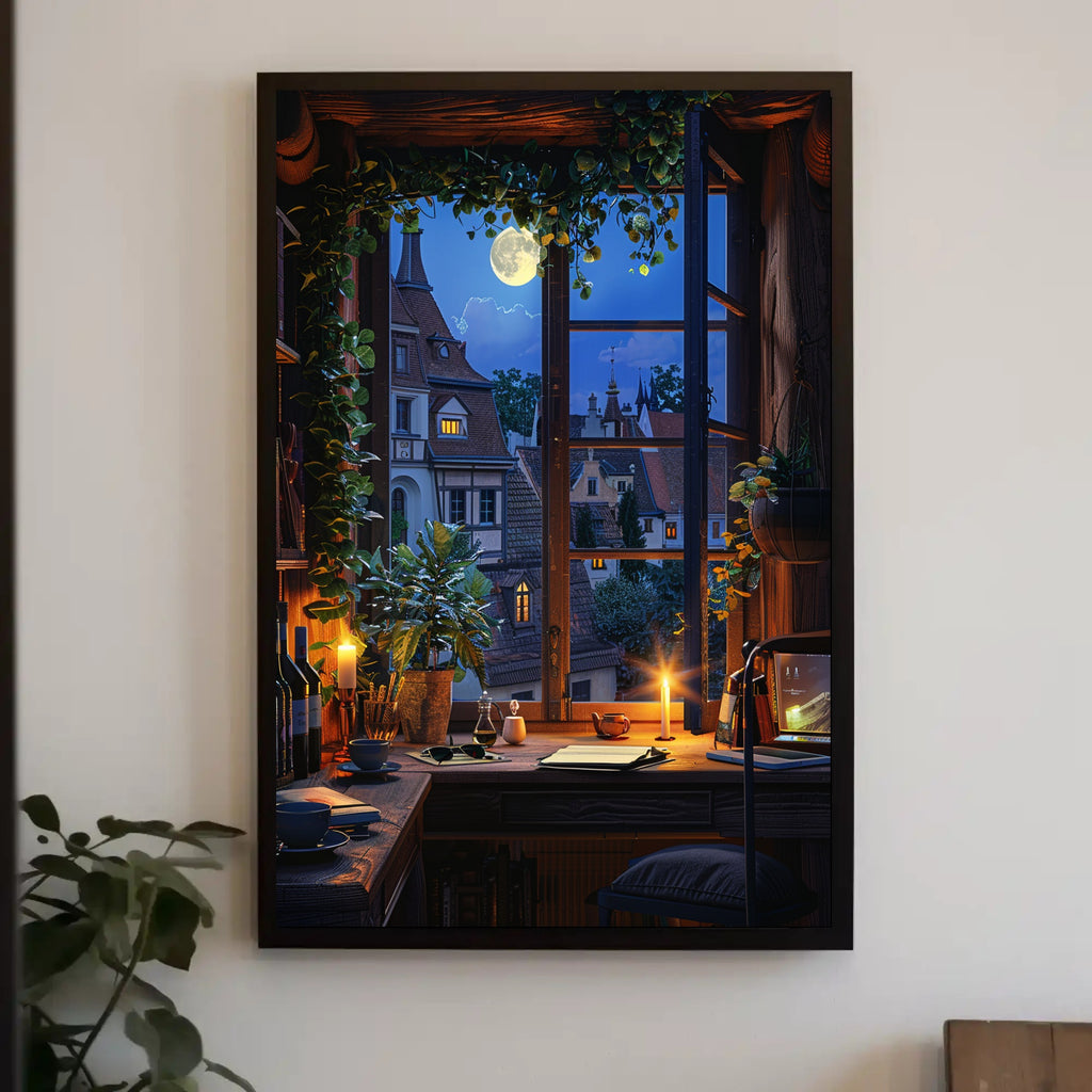 - Rich, cinematic setting: The scene places the figure within a detailed medieval townscape — steep gabled roofs, glowing window lights, and a luminous full moon — creating an immersive, mythical atmosphere.