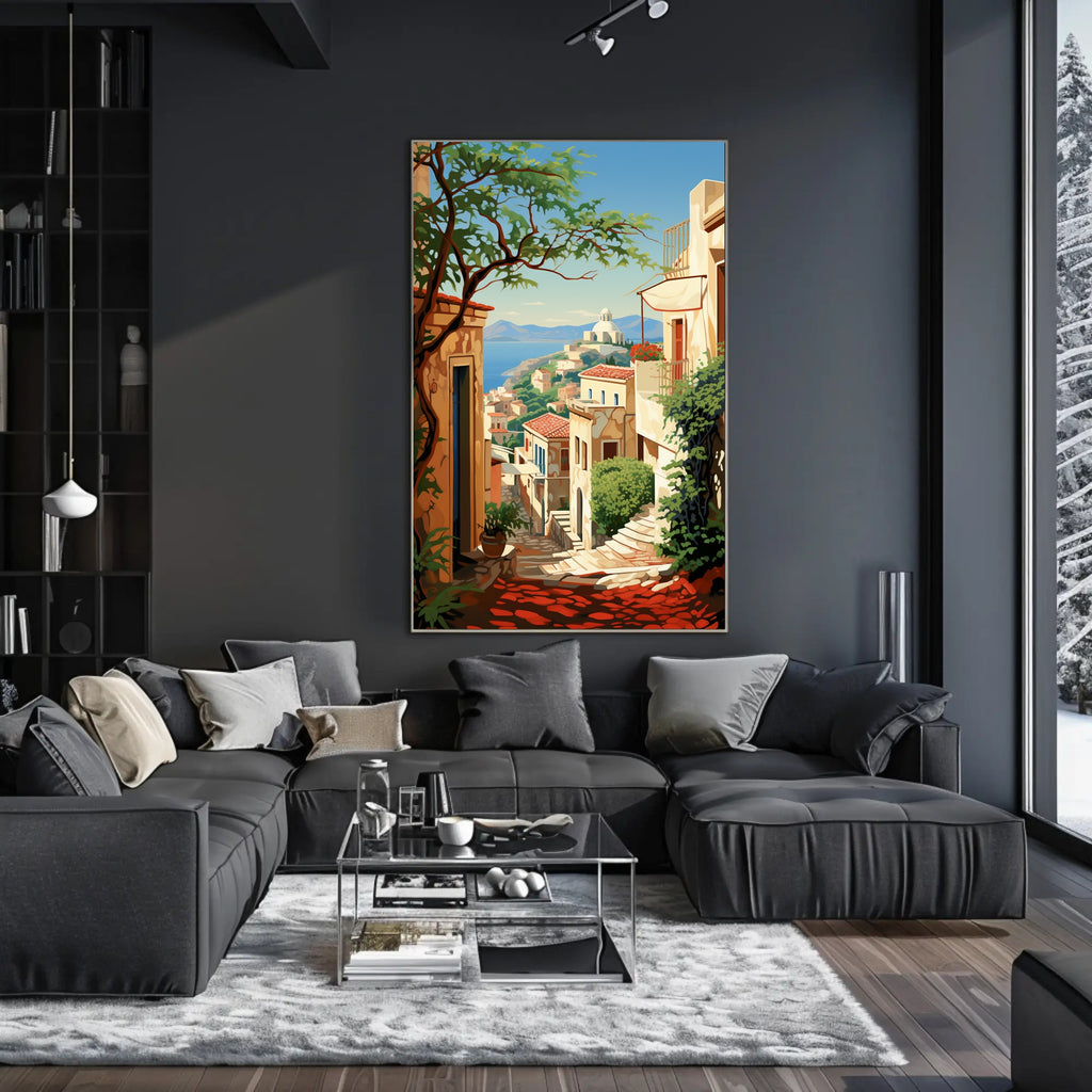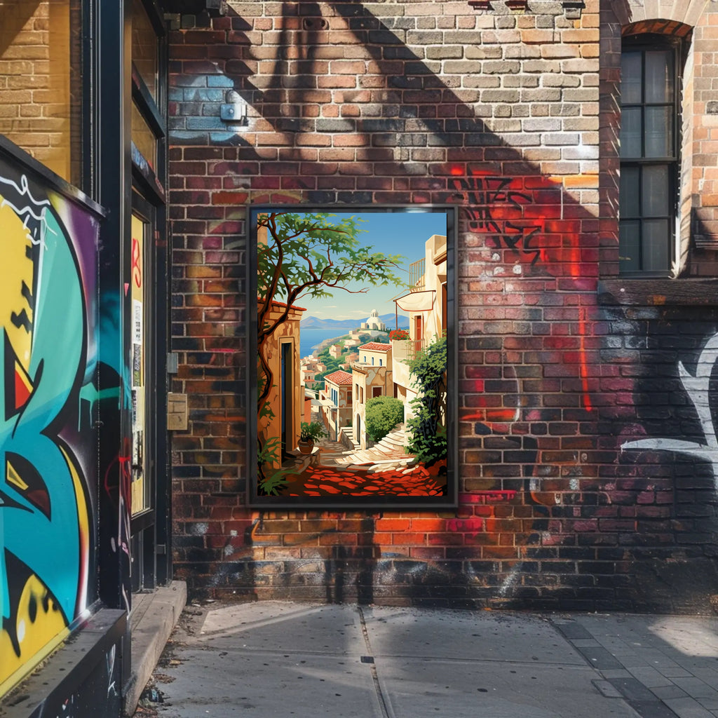 Bring the sun-drenched romance of the Mediterranean into your home with this Mediterranean Coastal Village Travel Poster by PosterGoat. Inspired by classic Greek architecture, the artwork captures narrow cobblestone streets, winding stone steps, whitewashed buildings with red-tiled roofs and a tranquil dome-roof church overlooking the sea — a perfect scenic art print for travel nostalgia and coastal village decor.
