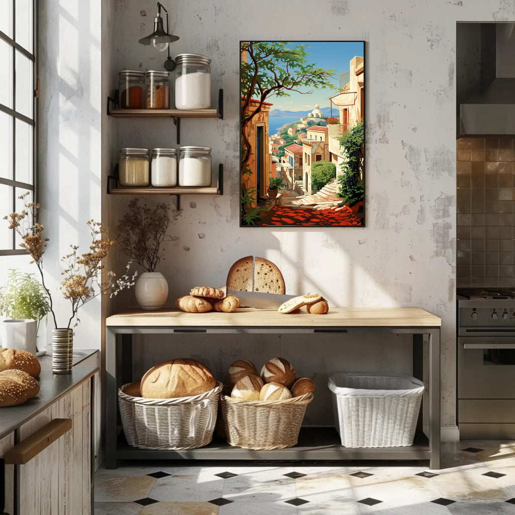Style & theme: Photorealism; Art & Aesthetic, Travel & Places — an idyllic travel poster and Mediterranean art piece.
