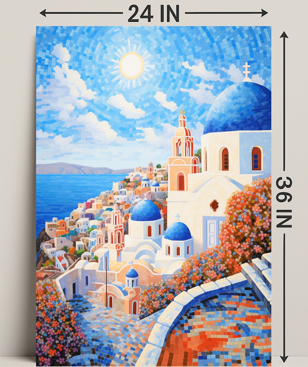 Bring the sun-drenched charm of the Mediterranean into your home with the Mediterranean Mosaic Poster from PosterGoat. This vibrant wall art print transforms a classic coastal scene into a luminous mosaic of color — blue-domed churches, terraced white buildings, winding cobblestone paths and a radiant sunburst rendered in careful tile-like strokes.