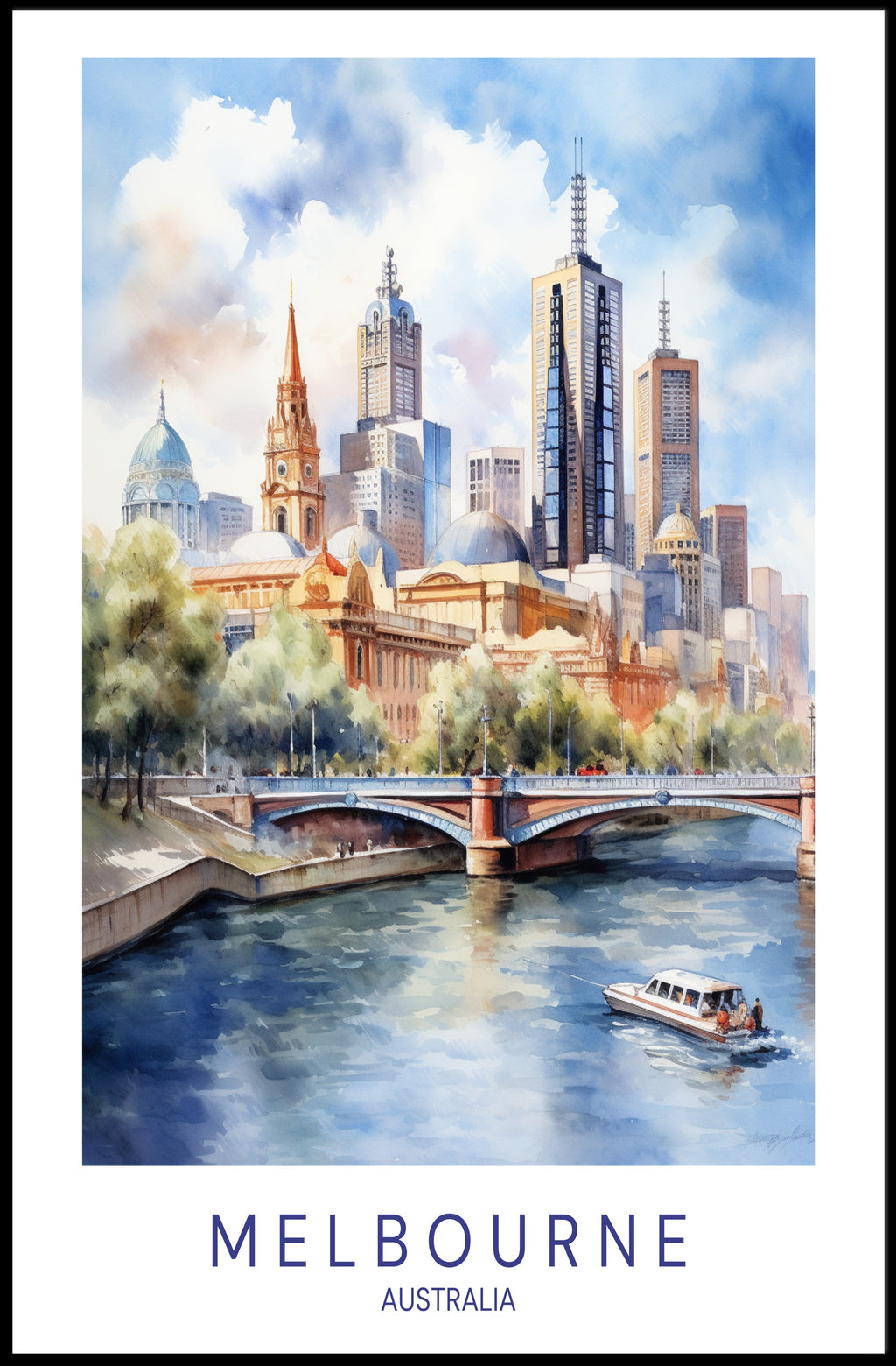 Melbourne Skyline Illustration Travel Poster by PosterGoat — an impressionistic, pop-art inspired print that captures Melbourne’s iconic riverfront, ornate domes and spired historic churches framed against a striking modern skyline.