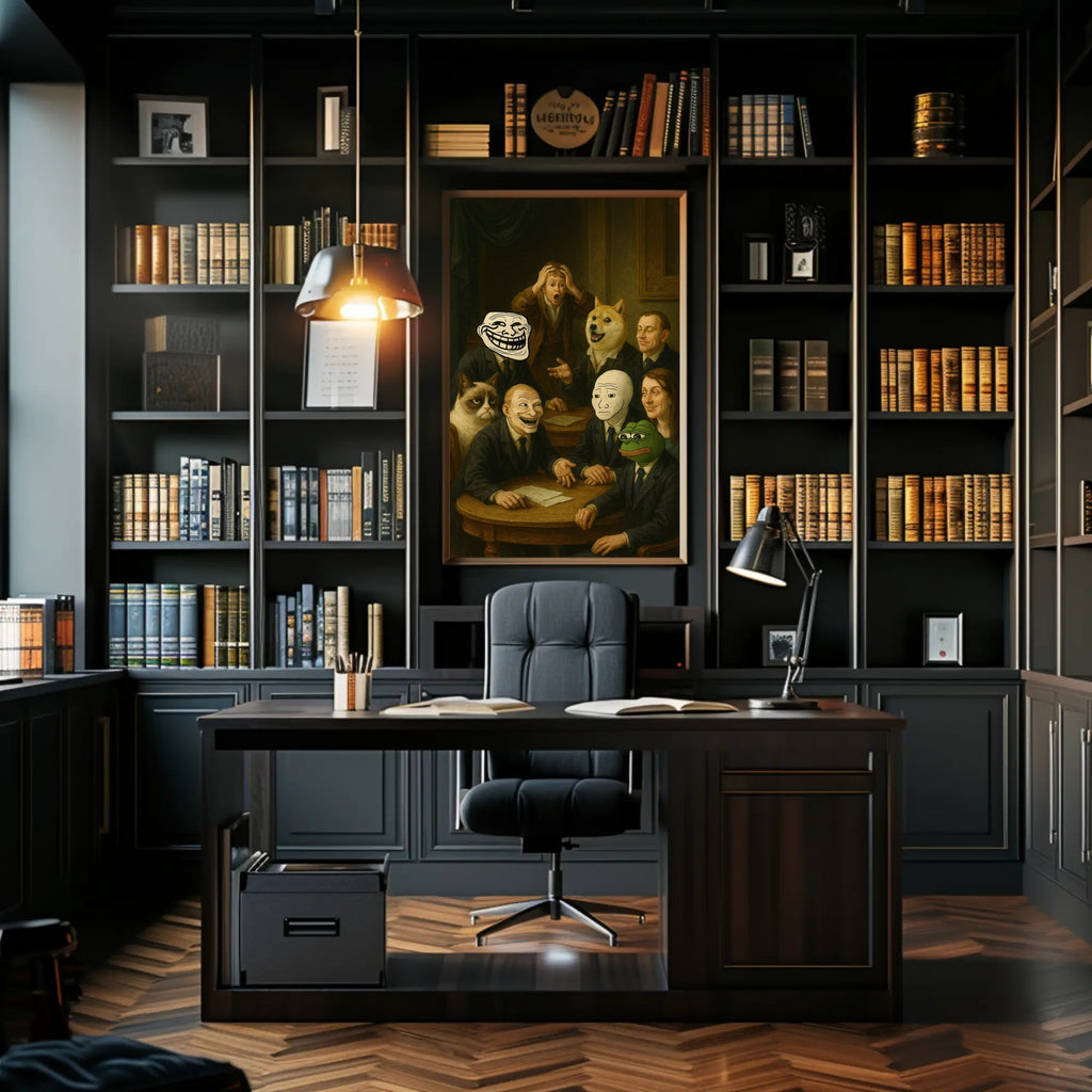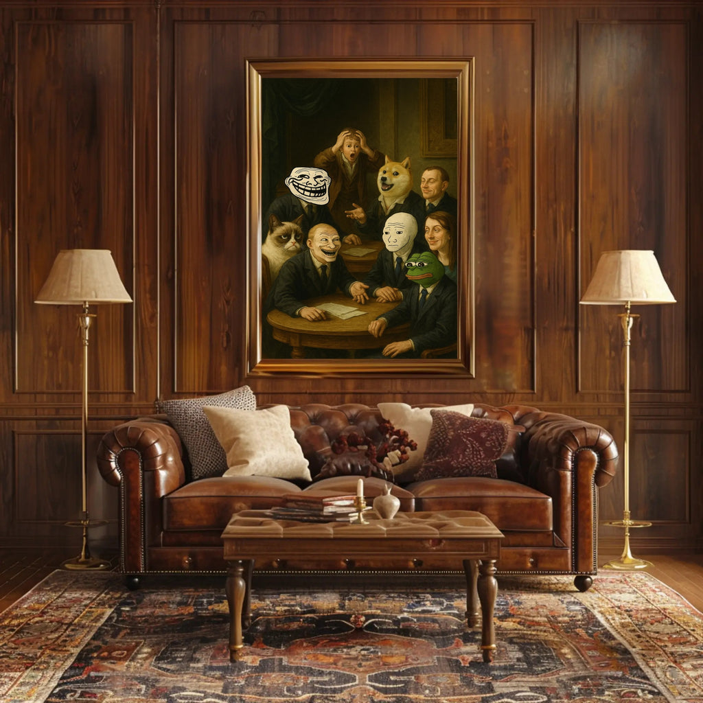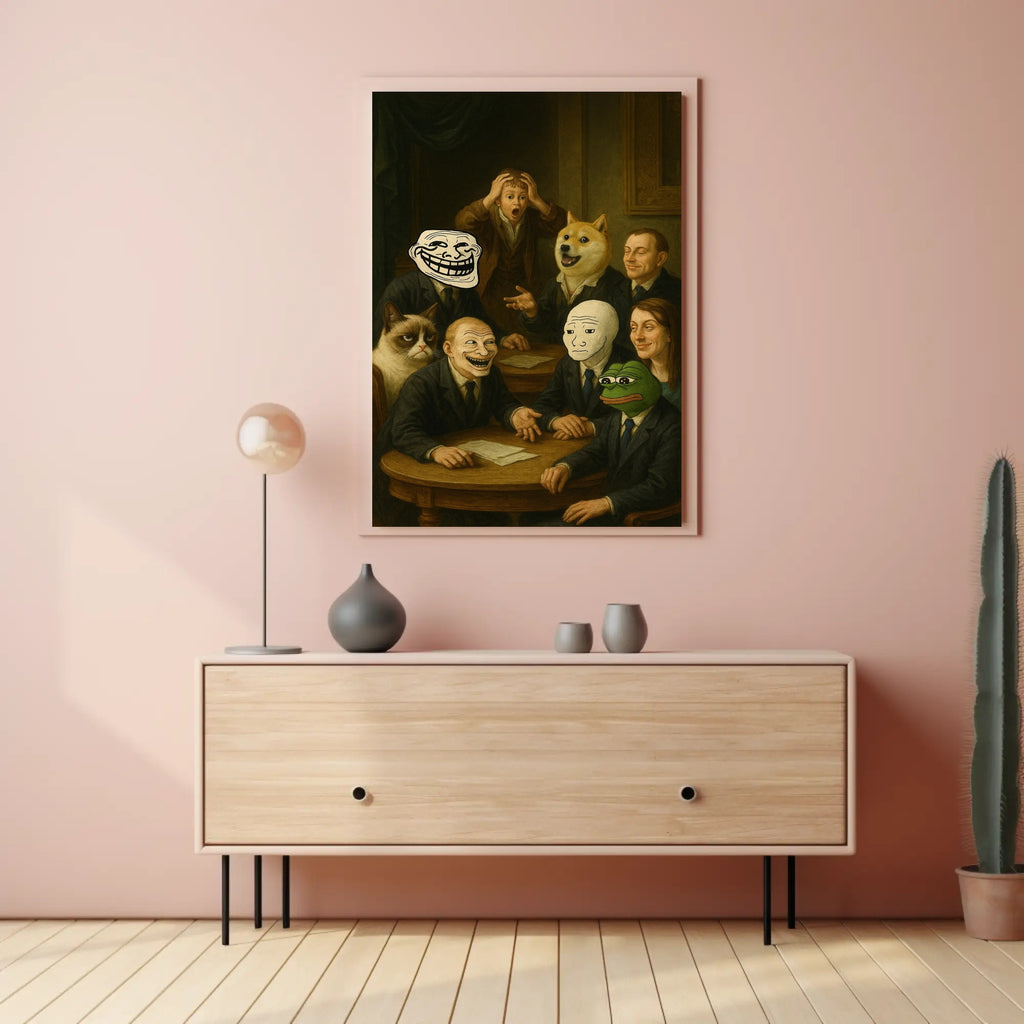 This poster captures a humorous juxtaposition of internet culture and historical ambiance. A surreal meeting room hosts a gathering of iconic meme characters like Trollface, Doge, Grumpy Cat, and Pepe the Frog, all dressed in formal attire. The playful clash between their modern meme expressions and the classical, historical setting evokes both nostalgia and contemporary humor. Perfect for fans of internet culture and those who appreciate comedic art, this piece adds a touch of whimsy to any space, making it a conversation starter and a unique addition to pop culture collections.