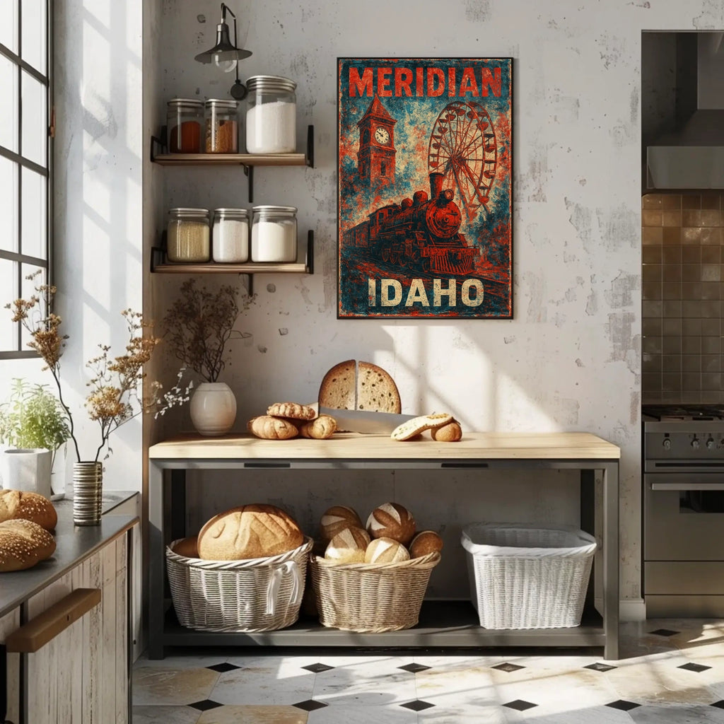 Celebrate the charm of Meridian, Idaho, with this captivating vintage-style poster that captures the essence of historical transportation and communal gatherings. Featuring a central steam locomotive, this piece pays homage to the industrial heritage of the region. The left showcases a classic clock tower, while the right highlights a Ferris wheel, hinting at festive community events. The retro travel poster design is enriched with a textured effect and bold red and blue hues, creating a nostalgic and patriotic ambiance. Perfect for enthusiasts of cultural and local heritage, this artwork embodies the timeless spirit of Americana.