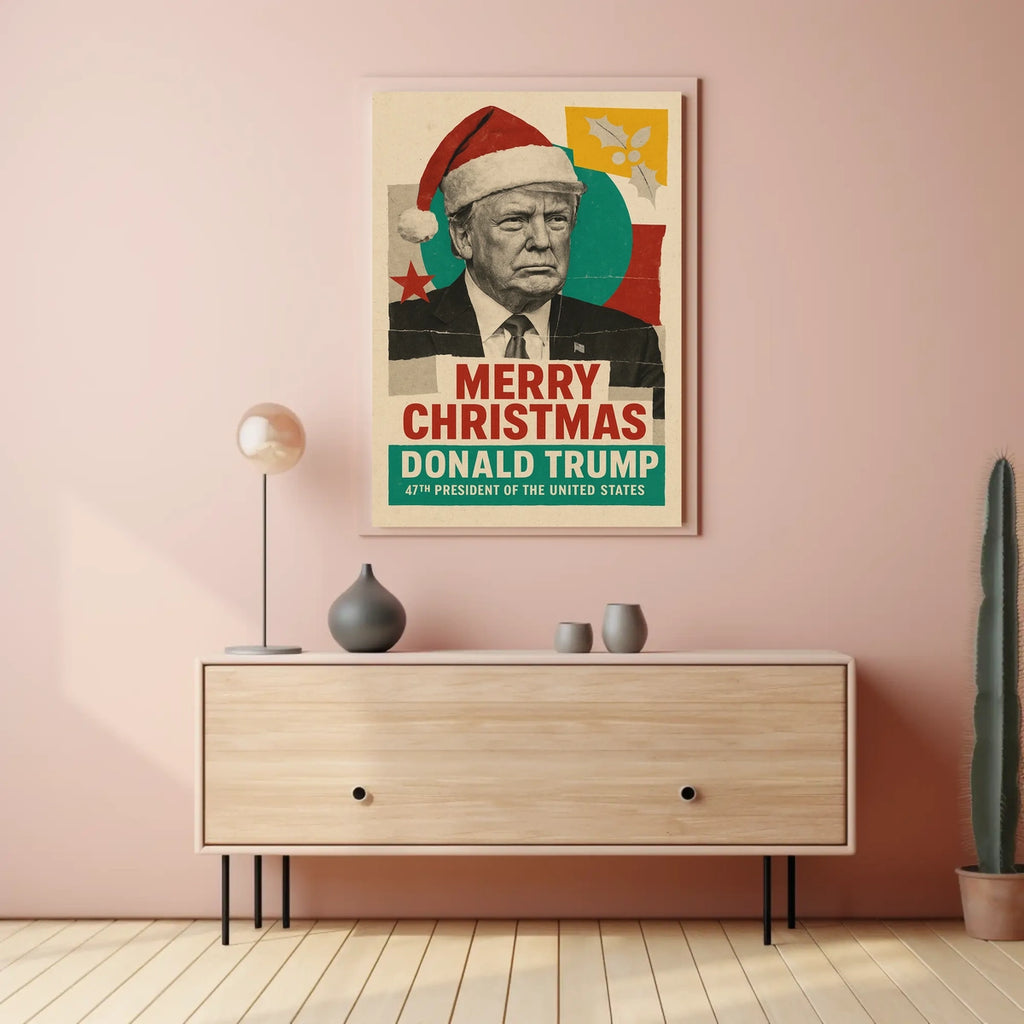 Celebrate the holiday season with a twist of satire and political flair with this striking black-and-white illustration of a distinctly recognizable man sporting a traditional Santa hat. Masterfully bridging the realms of festive cheer and clever commentary, this poster combines bold art with a nod to political designs, making it an ideal conversation starter for your home or office. The stark monochrome contrasts with classic red typography, creating an eye-catching display that not only delivers a seasonal message but also prompts thought and discussion. Perfect for those who appreciate humor in art.