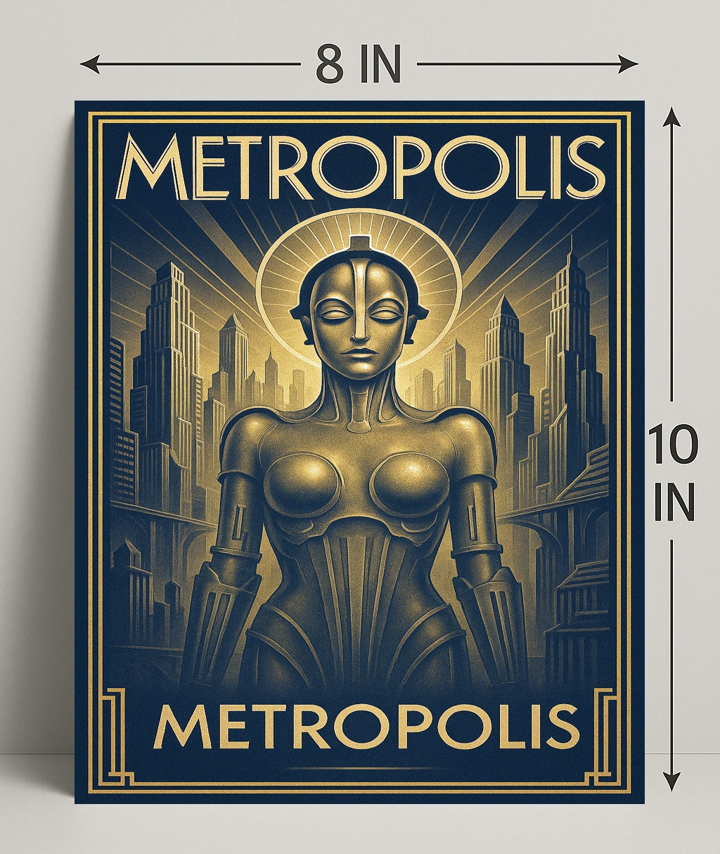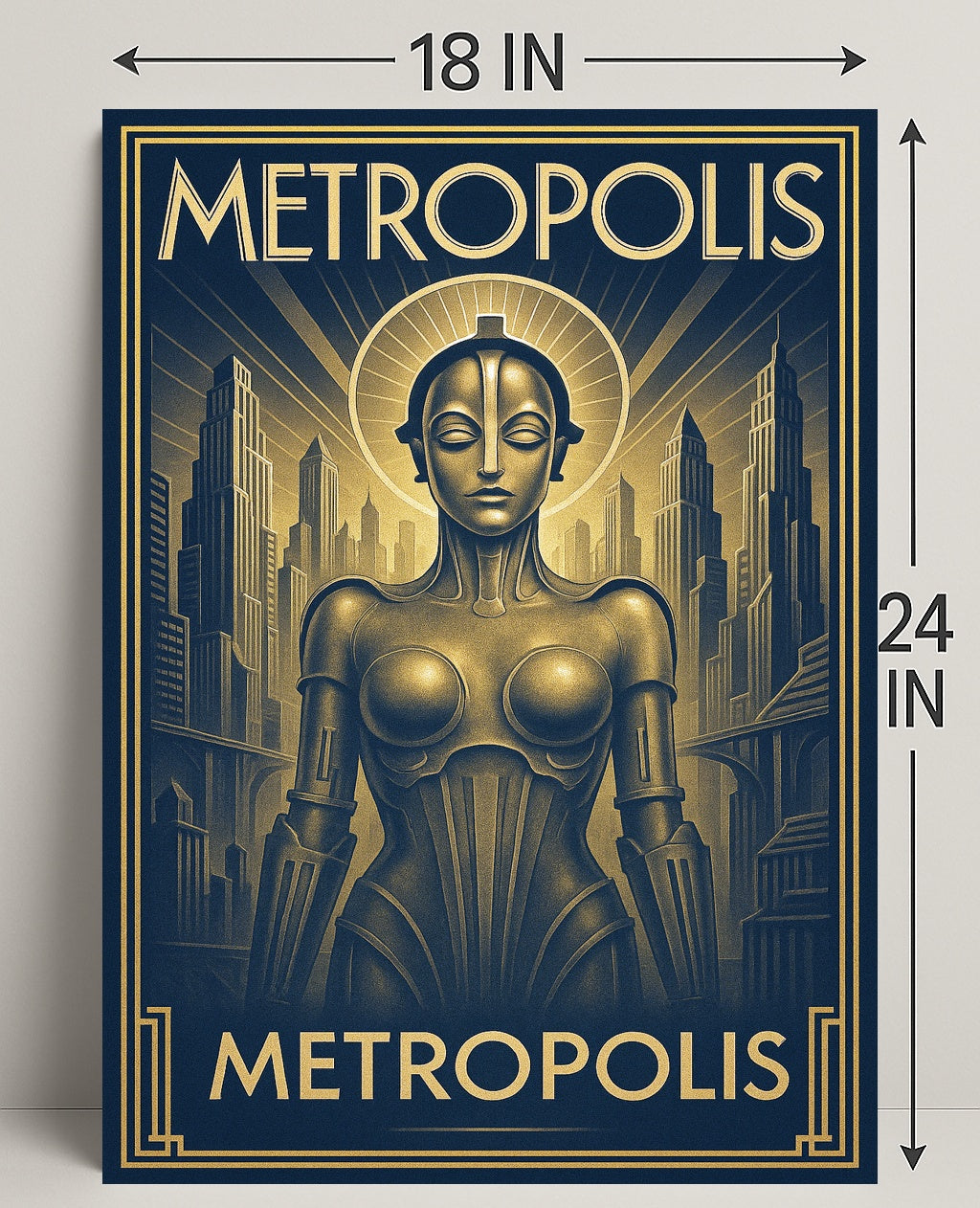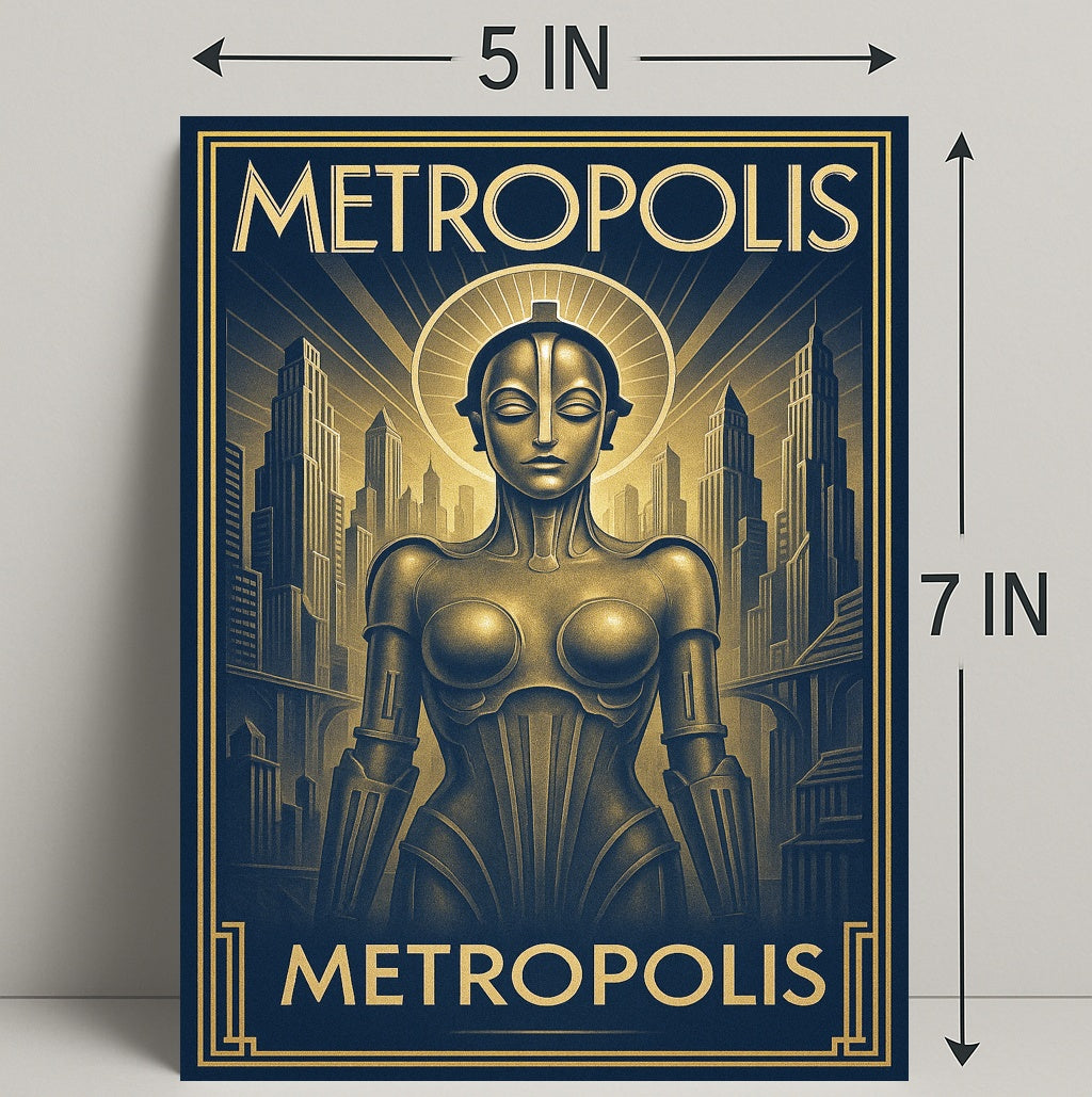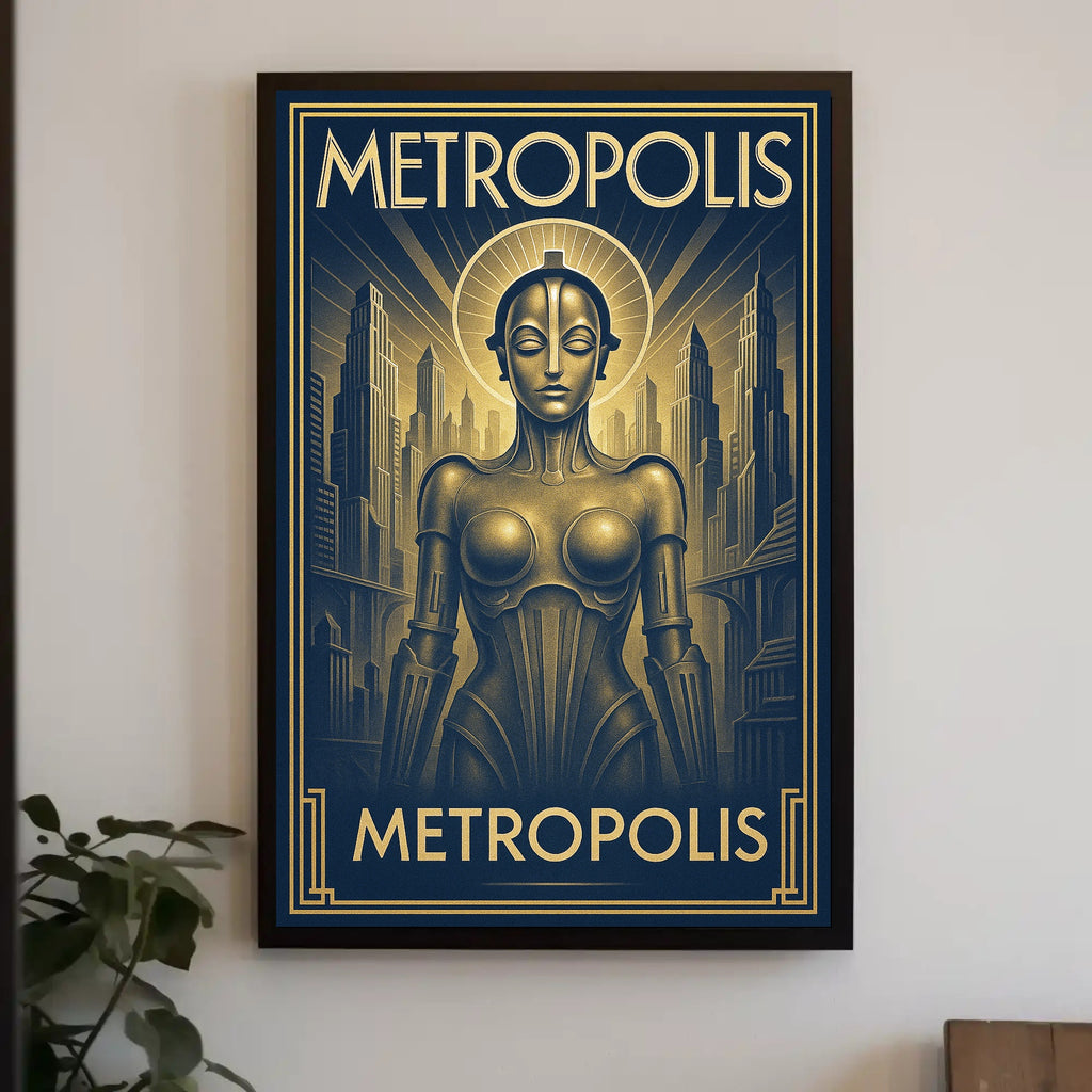 Metropolis — Art Deco Futurism Poster by PosterGoat blends bold Art Deco geometry with sleek futurist imagery to create a striking centerpiece for any modern interior. This poster captures a towering metropolis and a sculptural robotic figure rendered in luxe gold-on-navy tones, bringing cinematic depth and timeless elegance to your walls. Ideal for home & garden decor, artwork collections, and poster enthusiasts who appreciate minimalist yet dramatic visual statements.