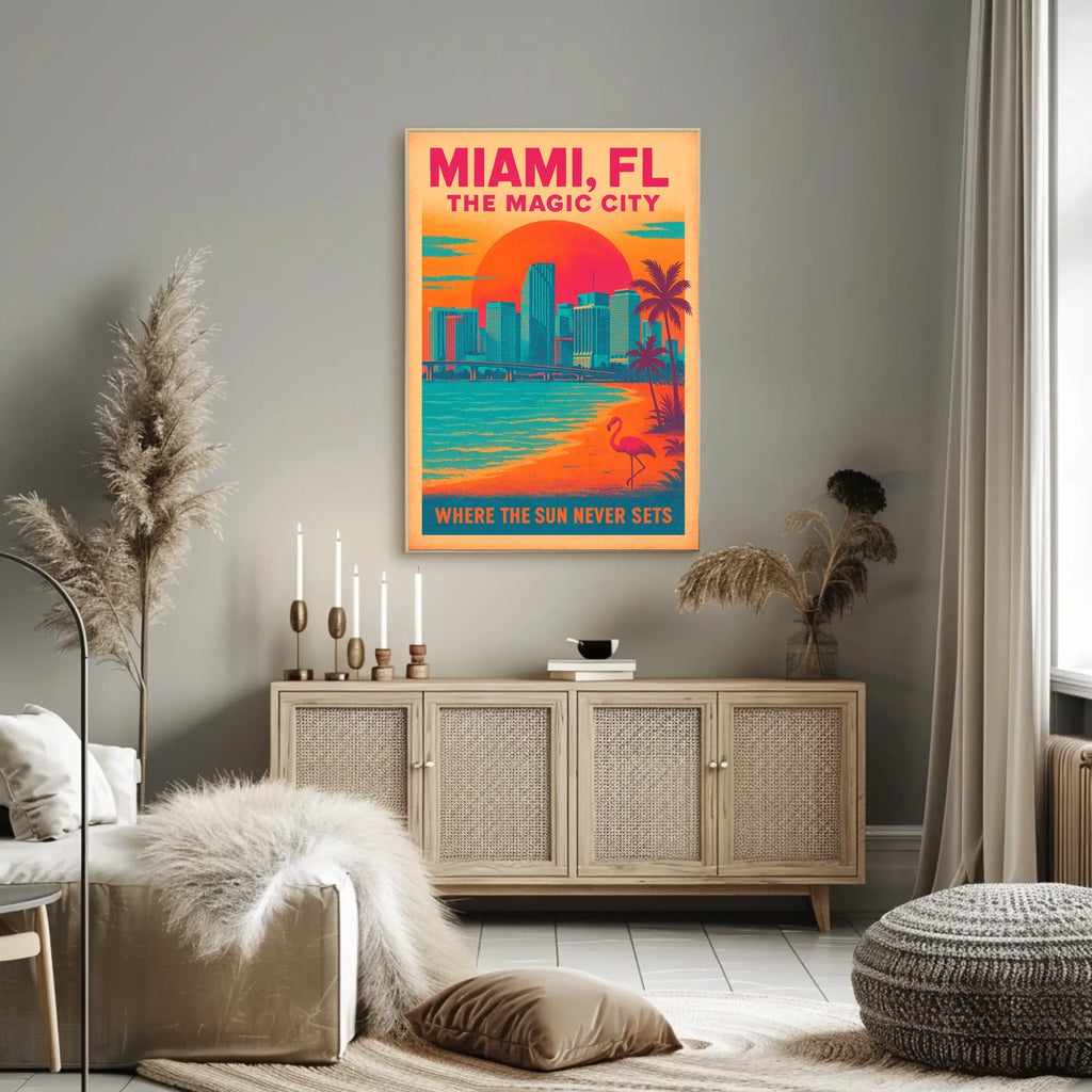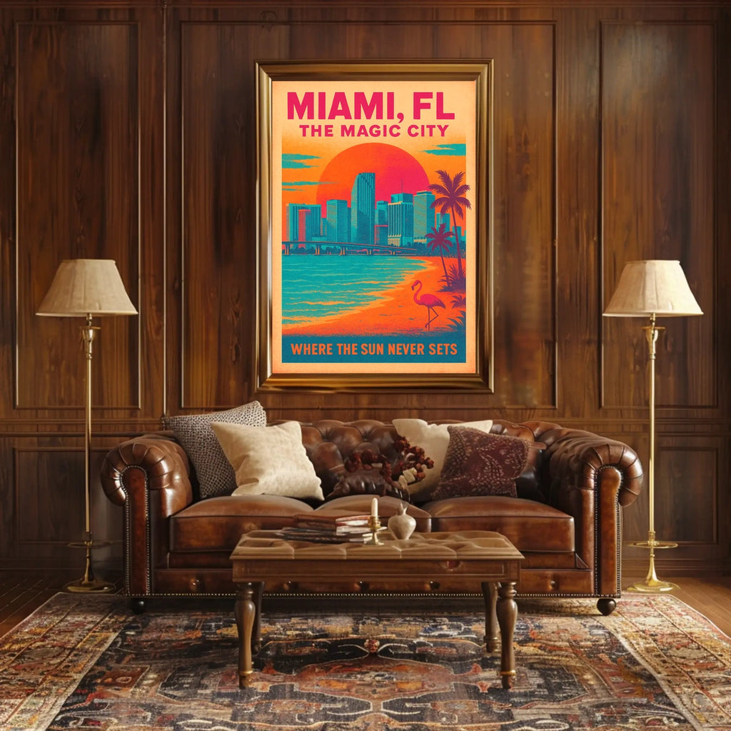 This Miami poster captures the essence of The Magic City with sun-soaked vibes and bold lines. It's perfect for decor lovers and wanderlust folks who want a dash of urban charm on their wall. With Art Deco influences and typography accents, this print brings a stylish, timeless look that works in living rooms, bedrooms, or hallways.