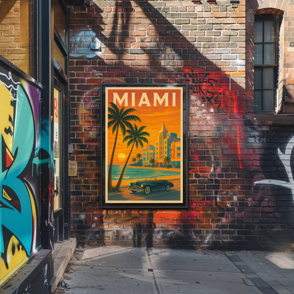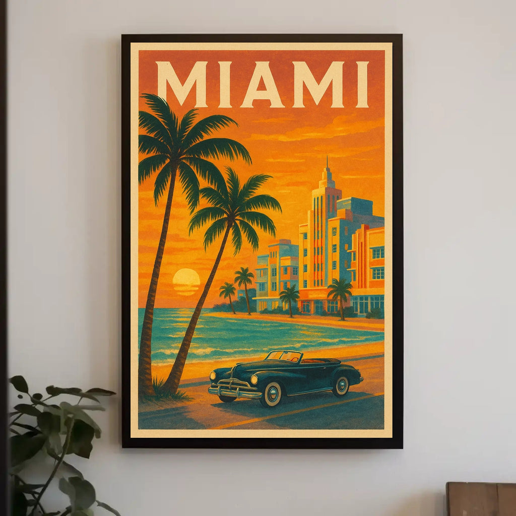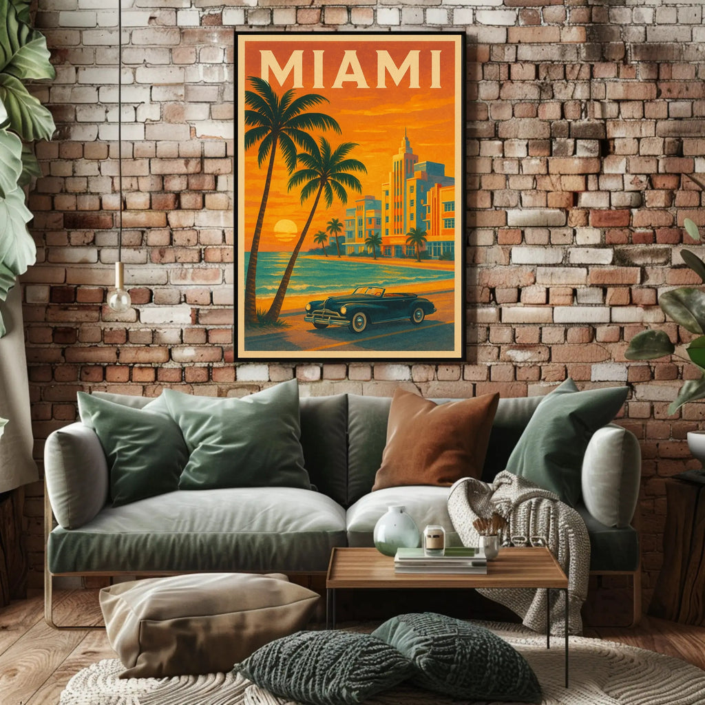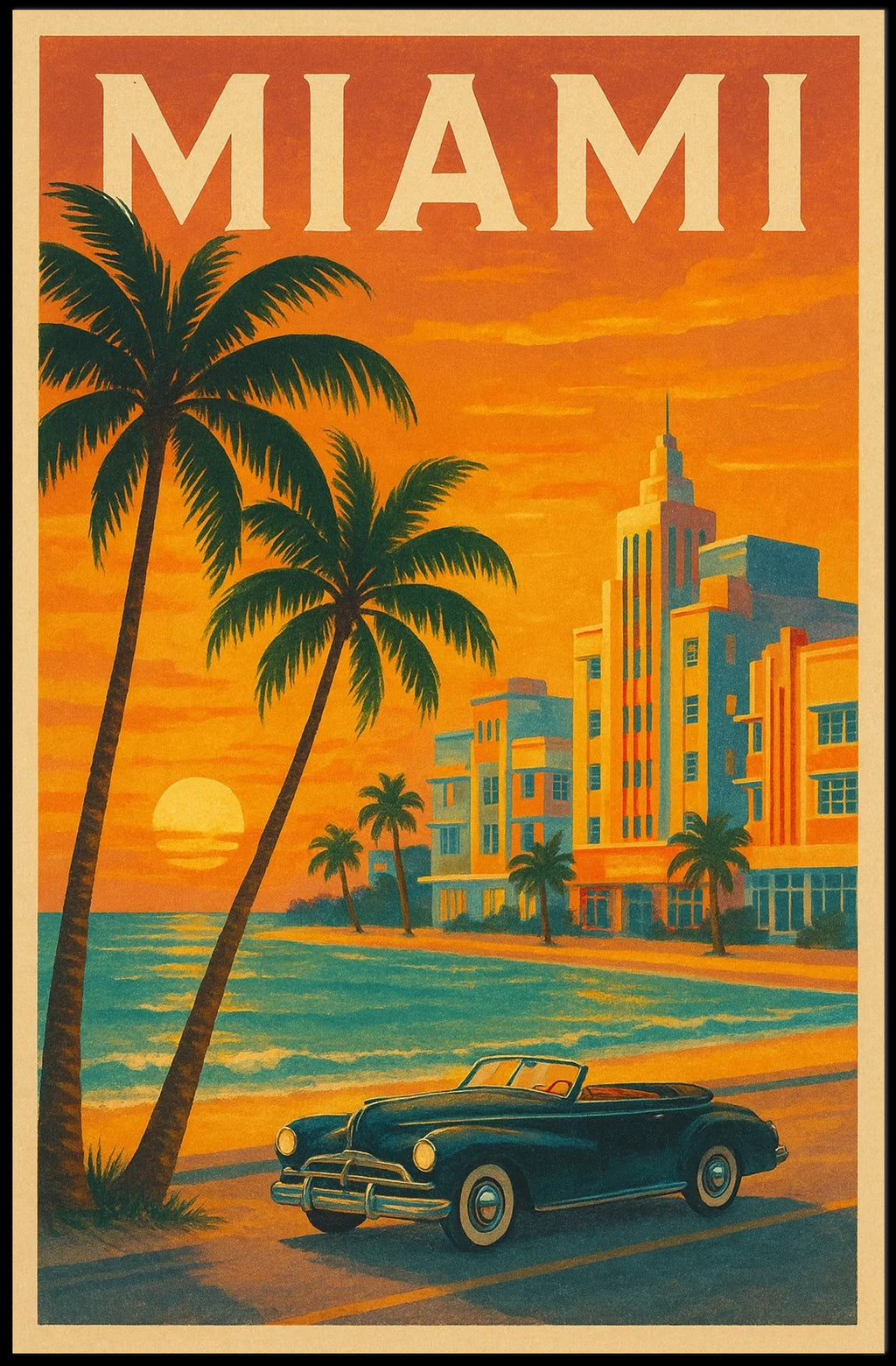 Transform your living space today with the Miami Sunset Convertible - Vintage Travel Poster. Don’t miss out on the opportunity to create your own slice of paradise; order now and let the allure of Miami brighten your home!