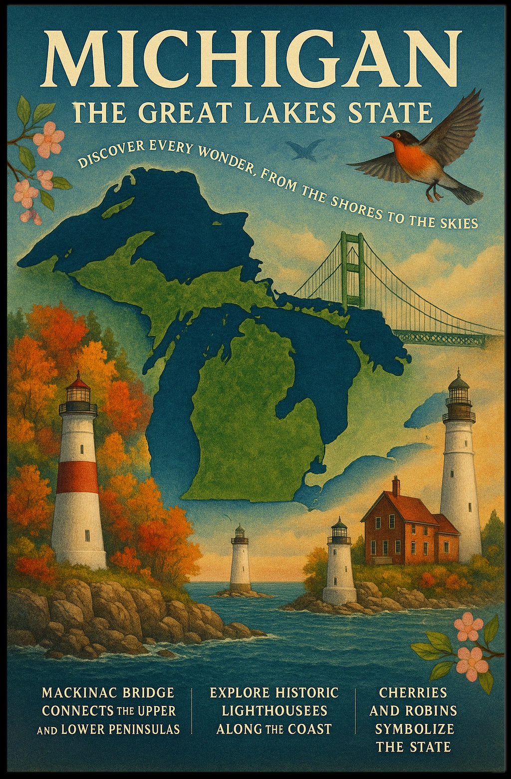 Experience Michigan, The Great Lakes State, where the Mackinac Bridge carves a bold silhouette across the water and historic lighthouses crown the scenic coast. From lush cherry orchards to resilient robins, this landscape blends natural splendor with adventurous spirit, inviting travelers to savor sweeping views, tranquil shores, and timeless Midwest charm along every horizon.