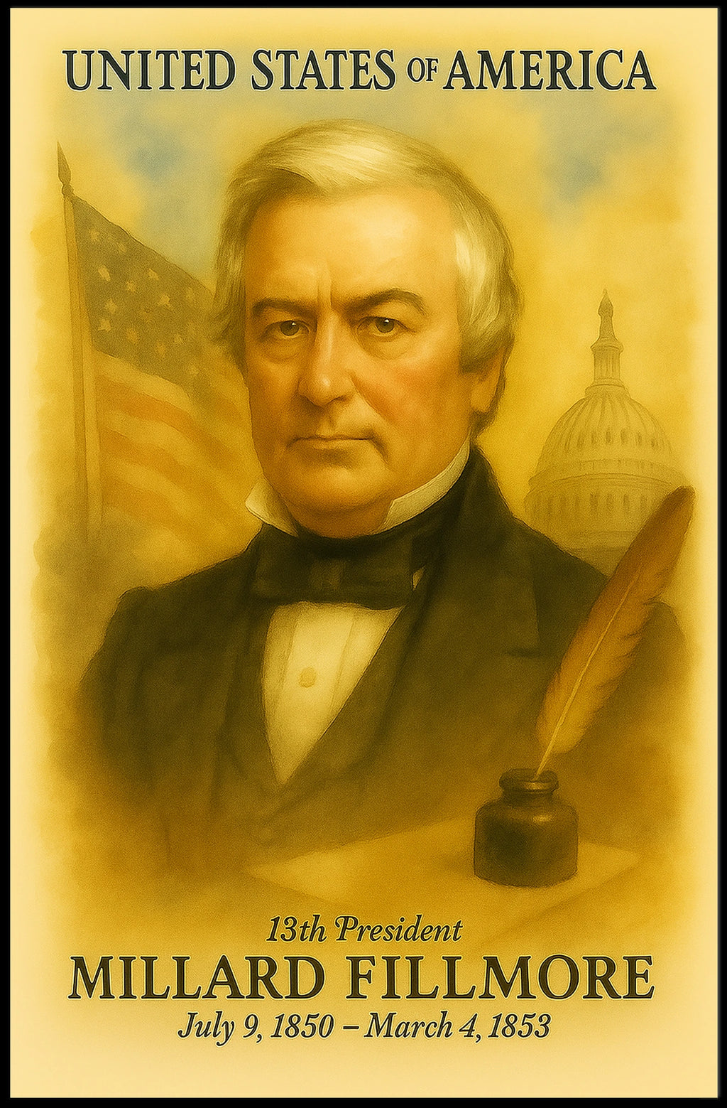 - Vintage watercolor portrait of Millard Fillmore with warm amber tones