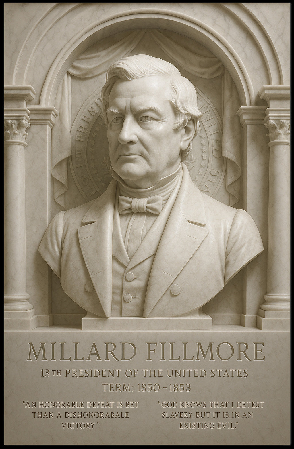 This Millard Fillmore bust poster blends historical reverence with decorative versatility—an ideal gift for history buffs, educators, and collectors seeking classical architecture and leadership legacy themes. Add this timeless American history poster to your wall and let a stately presidential tribute anchor your space.
