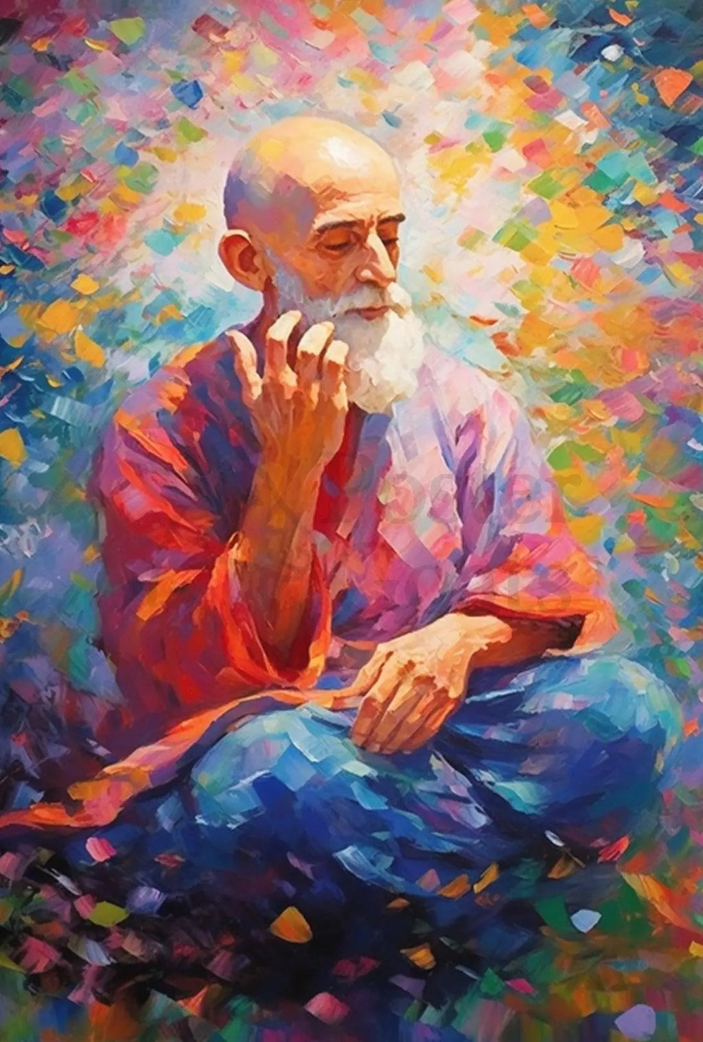 Bring a moment of calm and contemplative beauty to your home with the Mindful Elder's Serenity in Meditation Artistic Poster from PosterGoat. This vibrant, impressionistic print captures an elderly sage in quiet meditation — soft, thoughtful expression, a flowing white beard, and hands poised in a gentle gesture — set against a luminous cascade of color that feels like breath made visible. Perfect for meditation rooms, living spaces, or peaceful corners, this poster blends spiritual inspiration with modern artistic flair.