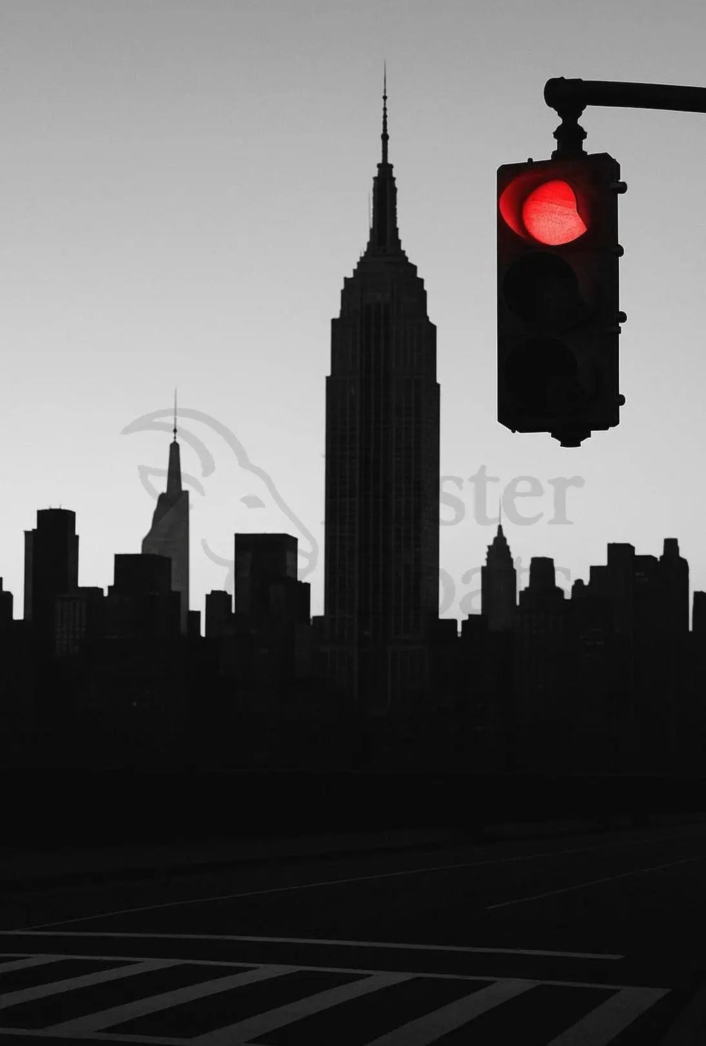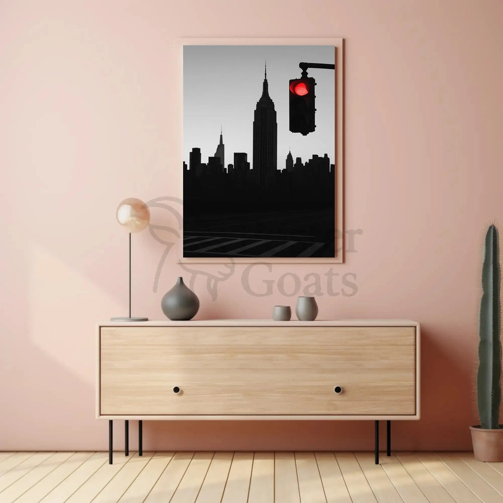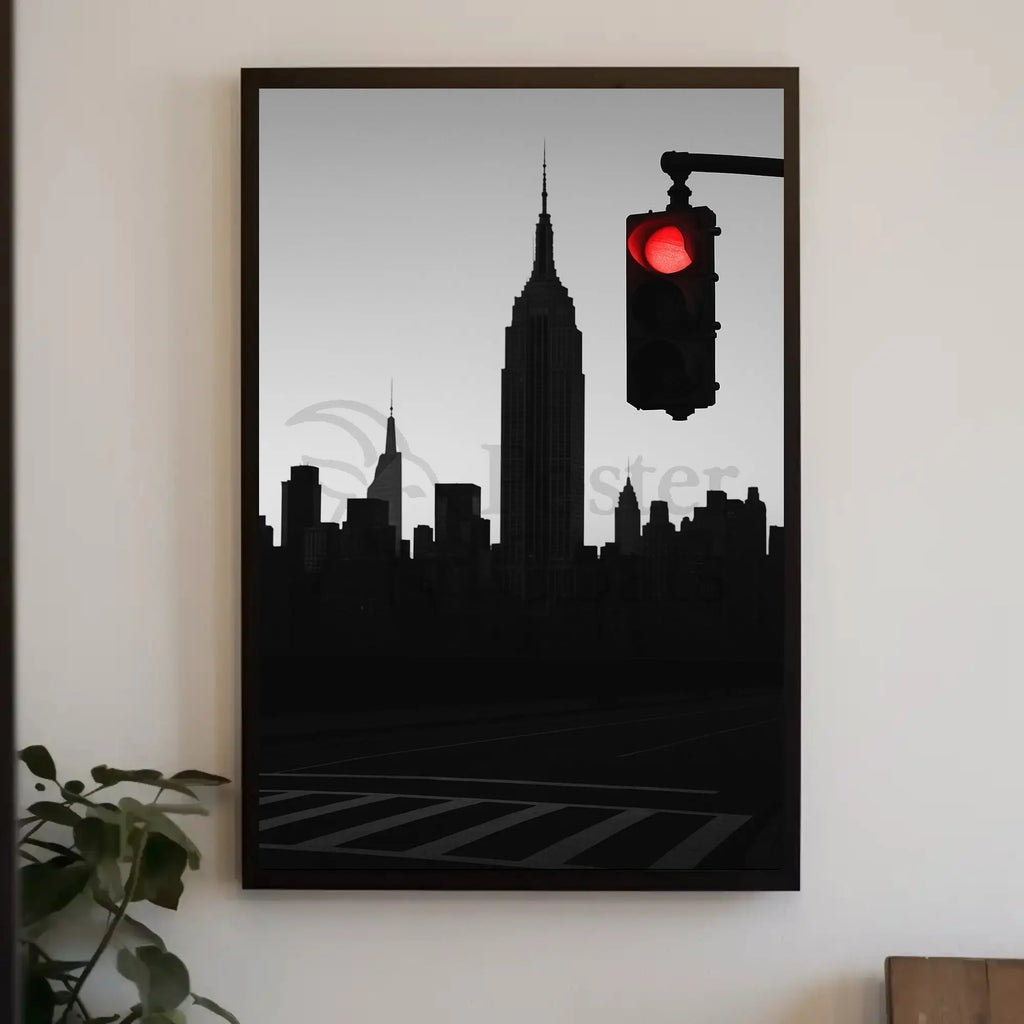 Minimalist Urban Skyline with Red Light Pop Culture Poster — a striking monochrome print from PosterGoat that captures the hush of the city skyline in crisp black-and-white while a single red traffic light punctuates the scene with cinematic drama. Perfect for contemporary and minimalist interiors, this poster blends urban grit with pop-culture attitude.
