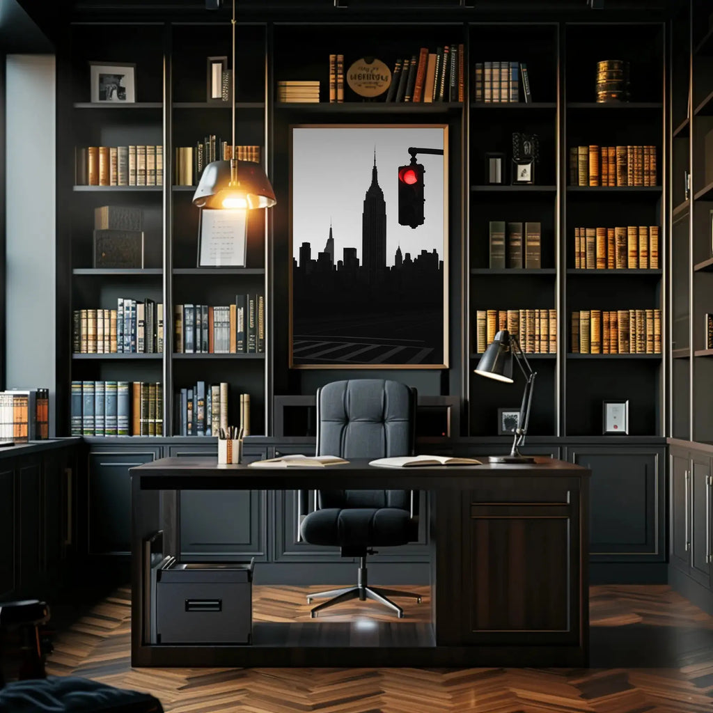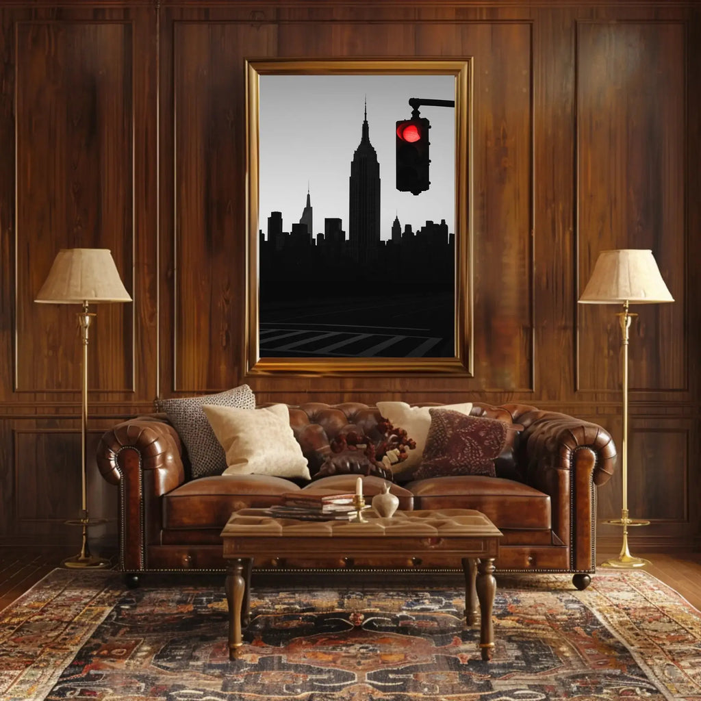 Bring the city home. Add the Minimalist Urban Skyline with Red Light Pop Culture Poster to your cart now and give your walls a timeless urban statement piece.
