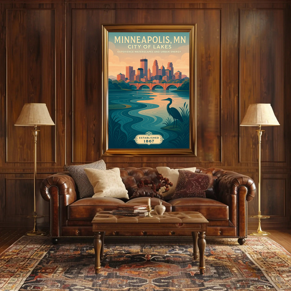 Immerse yourself in the serene beauty of Minneapolis with the stunning Minneapolis Skyline Sunset Travel Poster. This vintage-inspired artwork showcases the city's iconic skyline against a breathtaking sunset, perfectly encapsulating the charm of the "City of Lakes." With its harmonious color palette and artistic flair, this poster is a must-have for any art lover or travel enthusiast.