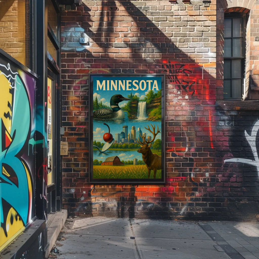 Explore the diverse landscapes and vibrant culture of Minnesota with this captivating travel poster. Featuring iconic elements such as Minneapolis's skyline, the majestic Minnehaha Falls, and the famous Spoonbridge and Cherry sculpture, it brings together the state's natural beauty and urban charm. A whimsical yet realistic style captures the essence of Minnesota, highlighting its rich wildlife including loons and deer, and nodding to its agricultural roots with a barn and silo. The vivid color palette of greens, blues, and reds adds to the celebratory mood, making this poster a perfect addition for any enthusiast of Minnesota's treasures.