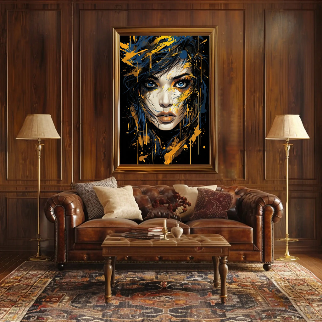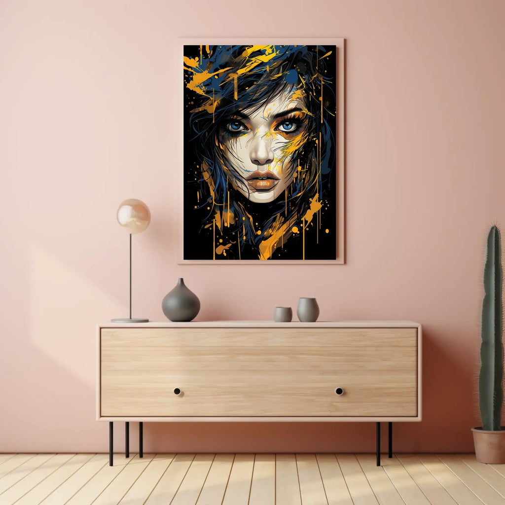 Modern Abstract Woman's Face Art Poster showcases a modern and abstract illustration of a woman's face, highlighted by vivid blue eyes and prominent lips. The artwork is infused with bold splashes of blue and orange, creating a dynamic and edgy atmosphere reminiscent of contemporary street art. The dramatic contrast against a dark background enhances its vibrant colors, making it a striking piece for any modern art collection.
