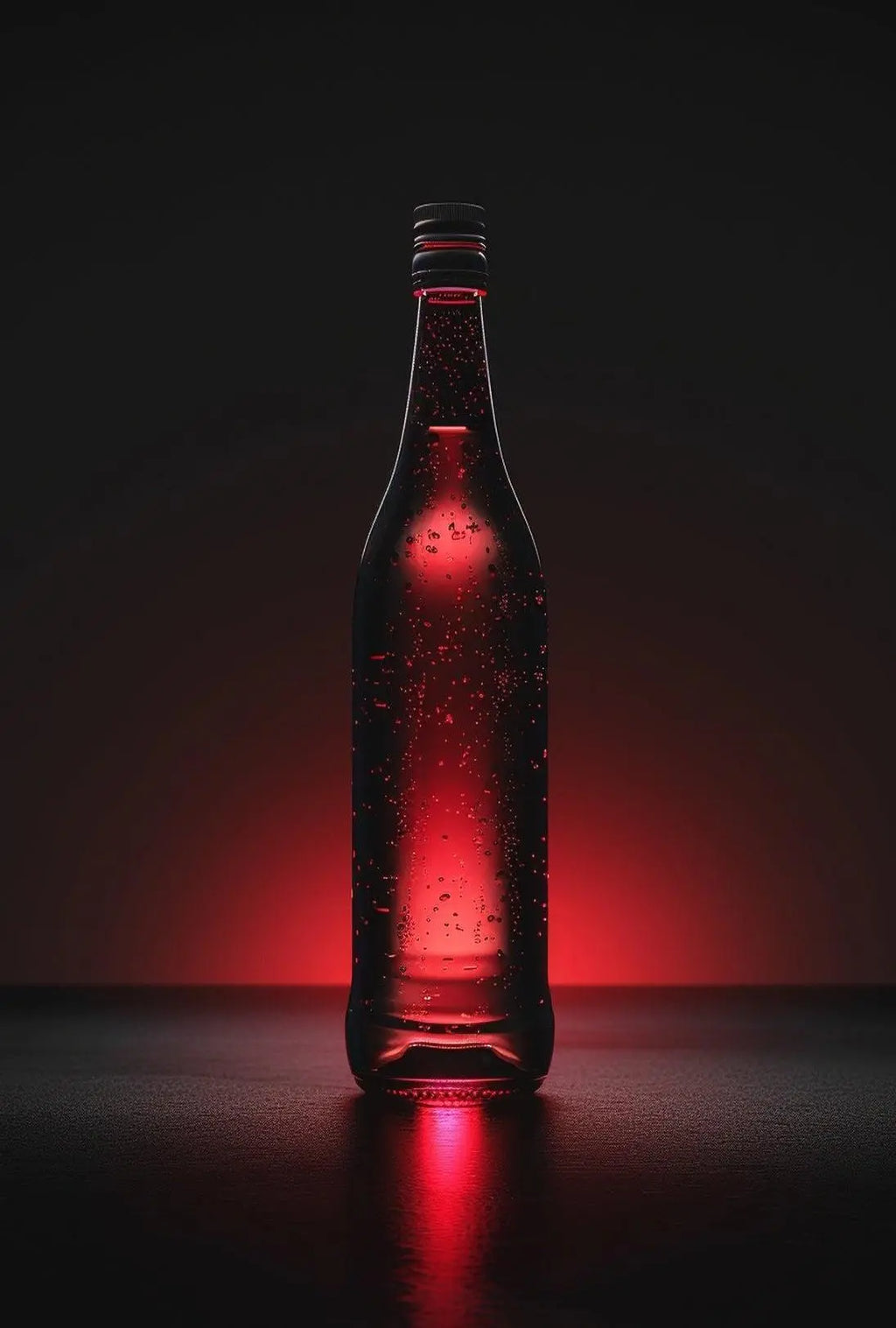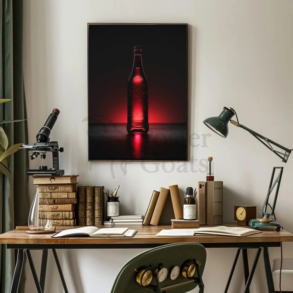 PosterGoat presents a striking Modern Sleek Beverage Illumination poster that elevates contemporary decor with cinematic drama and minimalist precision. A solitary beverage bottle emerges from a deep black field, its glass rimed with tiny bubbles and a glowing red core that casts a vivid reflection—an arresting focal point for living rooms, bars, studios, or commercial spaces.