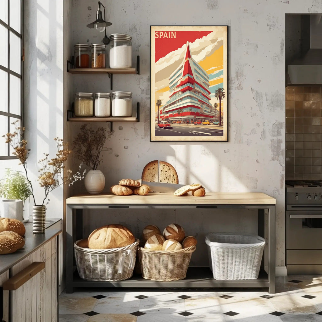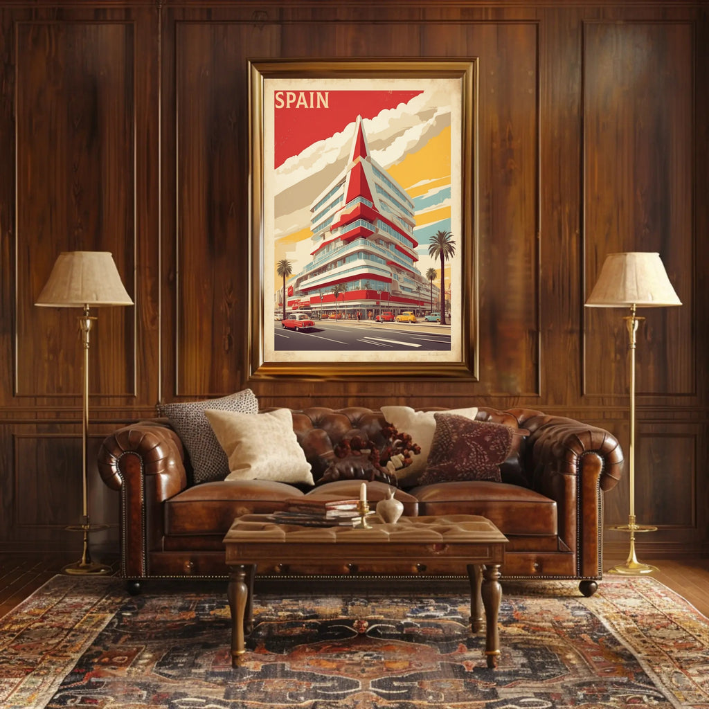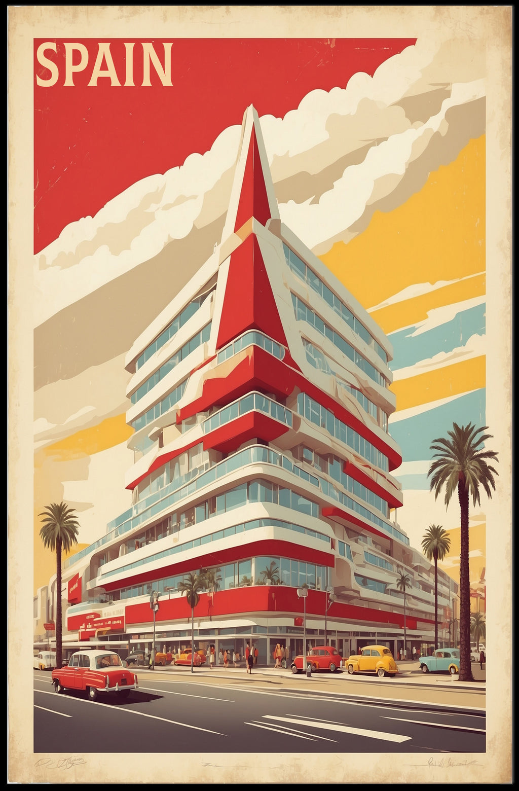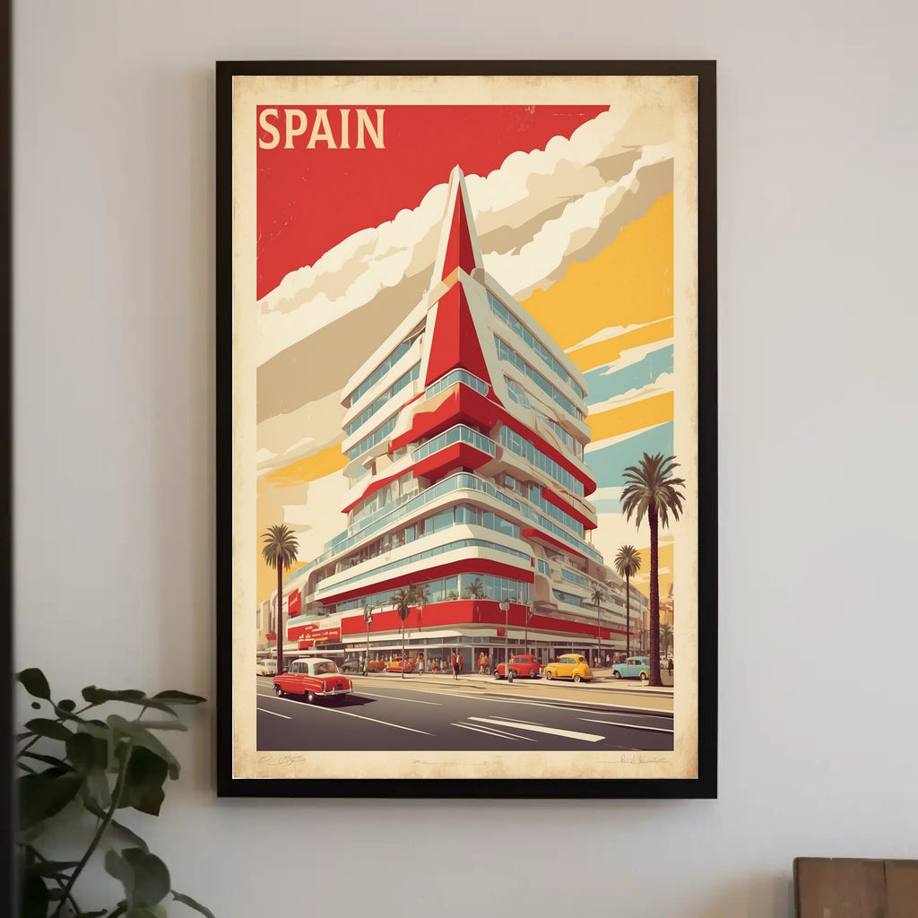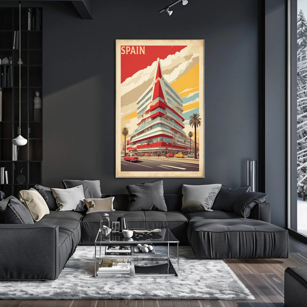 Modern Spain Architecture Travel Poster from PosterGoat captures the sun-soaked optimism of Spanish cityscapes with a retro-futuristic twist. This eye-catching poster blends mid-century modern lines, vivid block colors and sleek glass balconies to create a timeless piece of wall art that energizes any room.