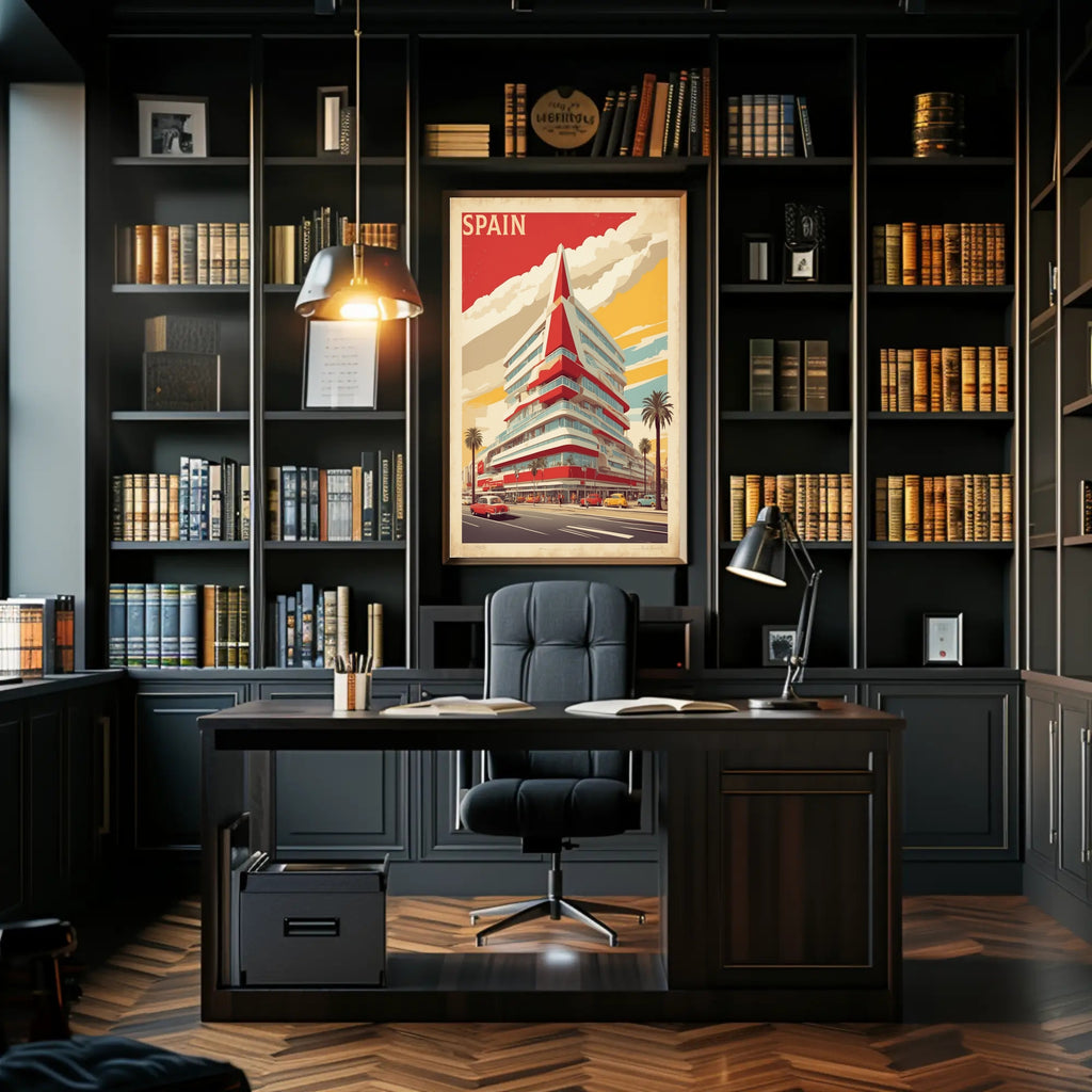 This high-impact print makes an instant focal point above a console, in a gallery wall, or framed in a modern office. Bring home a slice of Spanish architecture and retro travel romance today — order your PosterGoat Modern Spain Architecture Travel Poster now and transform your walls with vibrant, architectural flair.