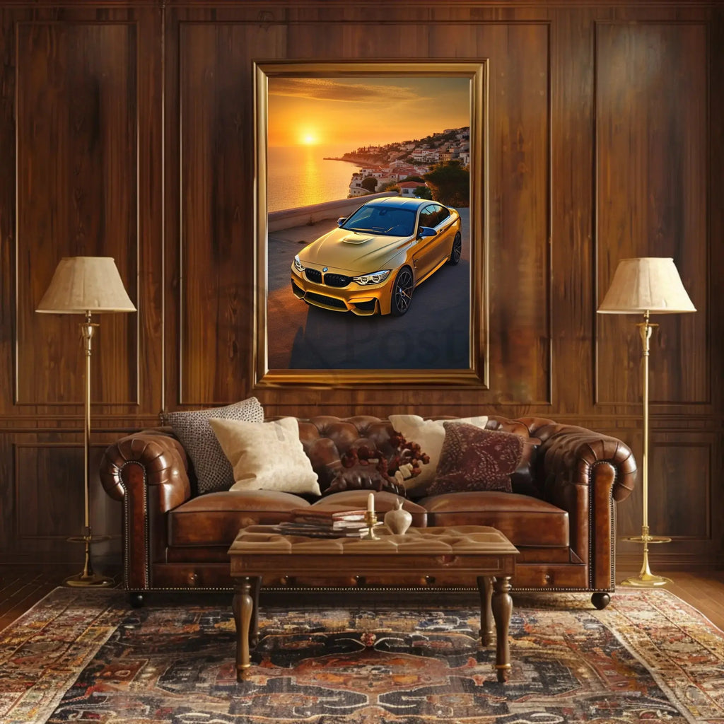 Travel & aesthetic theme: Coastal town artwork meets contemporary vehicle design—ideal for modern living rooms, offices, garages, or home galleries.