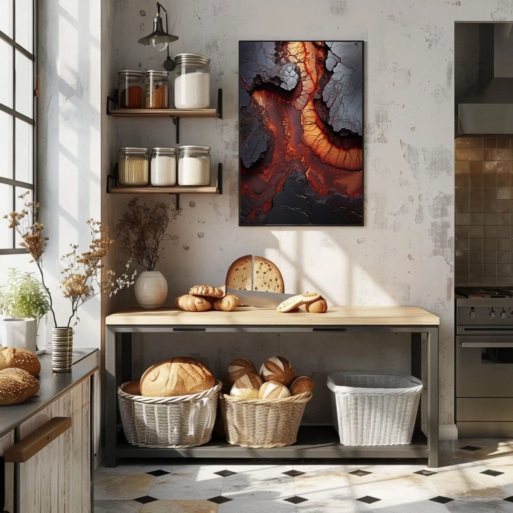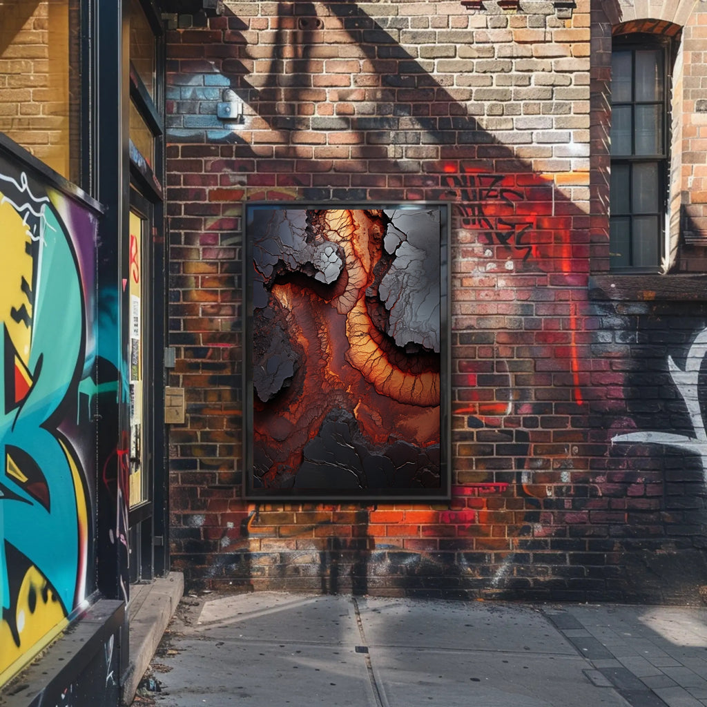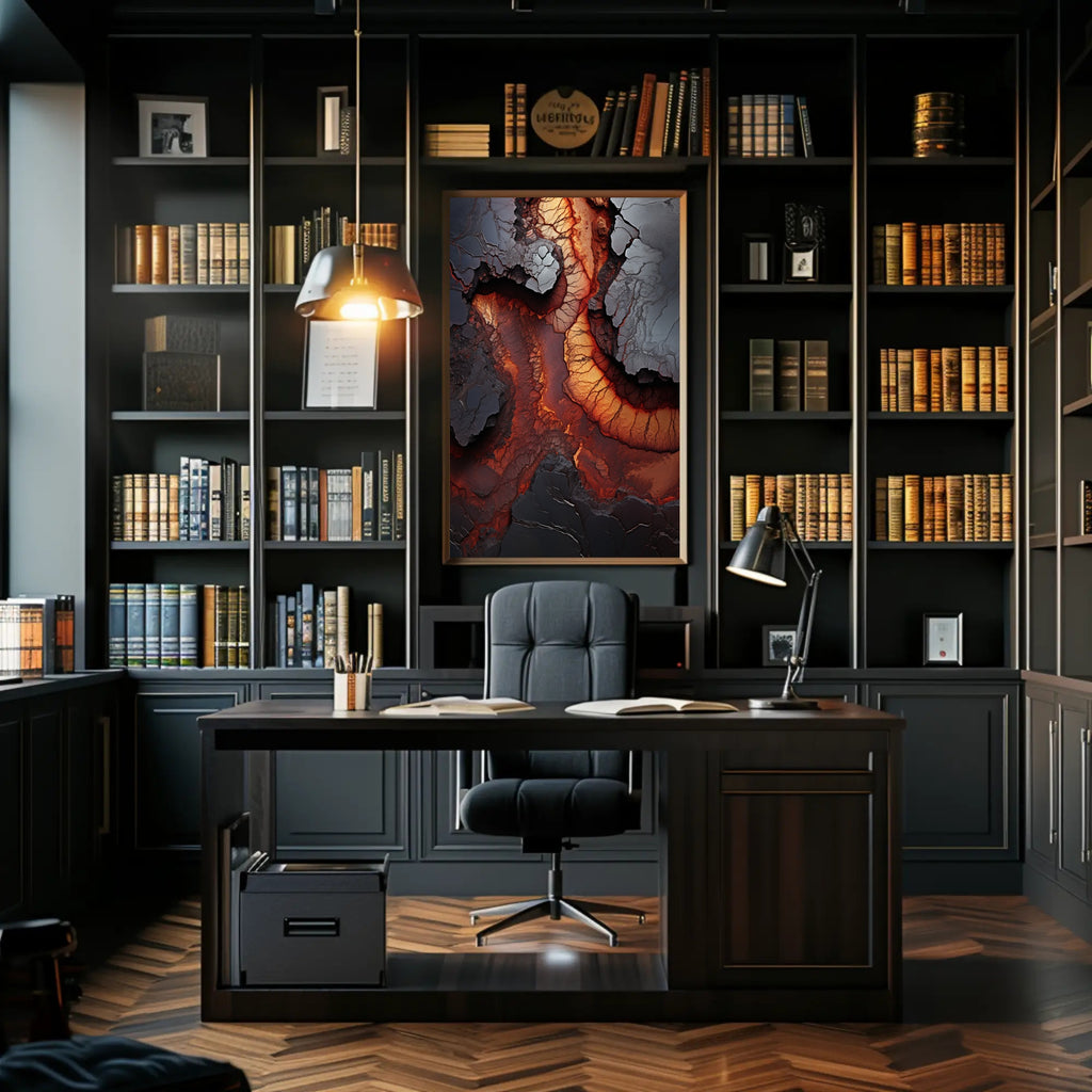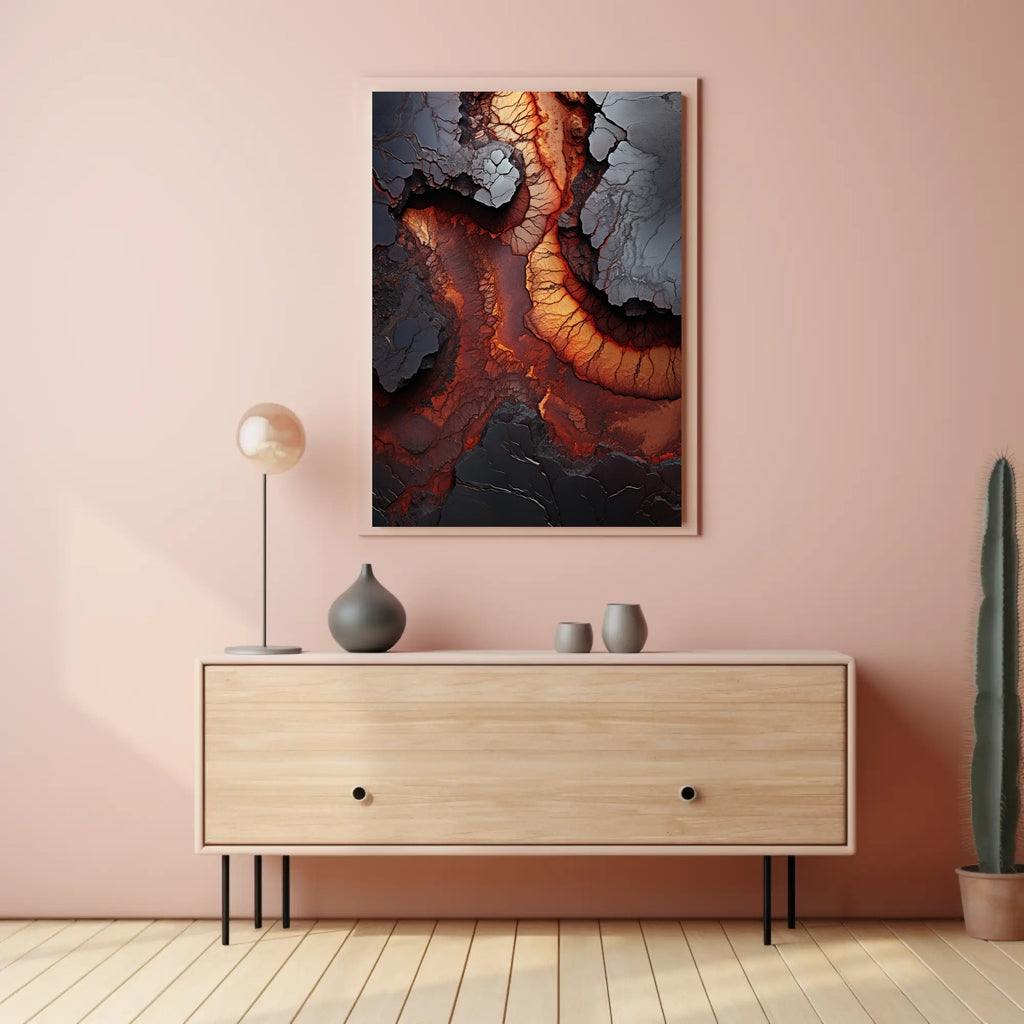 This poster is an ideal gift for art lovers, geology enthusiasts, or anyone seeking a bold focal point — use it as a standalone statement piece or as part of a layered gallery wall. The rich molten hues contrast beautifully with neutral walls and modern frames, as shown in the lifestyle images.