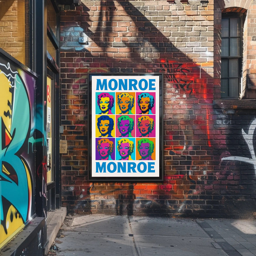 Celebrate iconic pop art style with the Monroe Pop Art Tribute Poster from PosterGoat — a vibrant, gallery-ready poster that instantly elevates any room in your Home & Garden decor collection. Inspired by classic pop-art motifs, this print features a striking 3x3 grid of Monroe portraits, bold lettering, and intense, contrasting colors that demand attention.