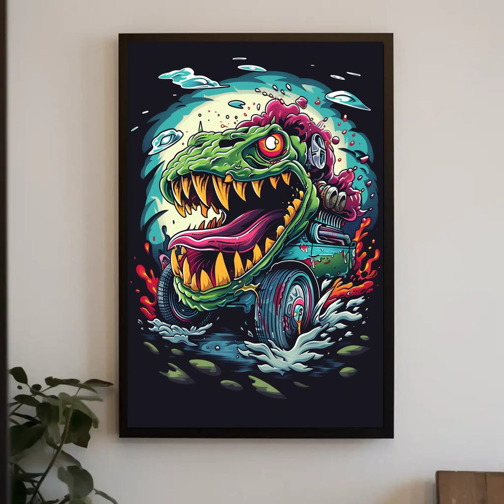 Capture the thrill of Monster Machine Mayhem with this striking poster that blends bold monster imagery with scenic-inspired art. Perfect for decor lovers and wanderlust spirits, it adds a playful, adventurous vibe to any room.